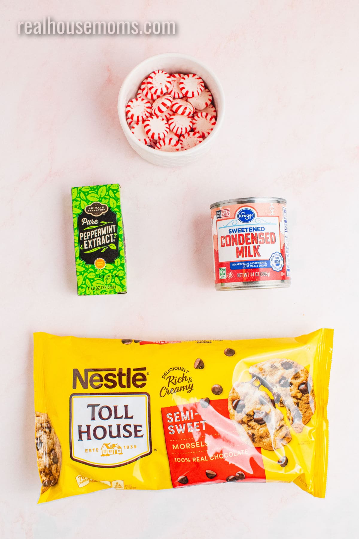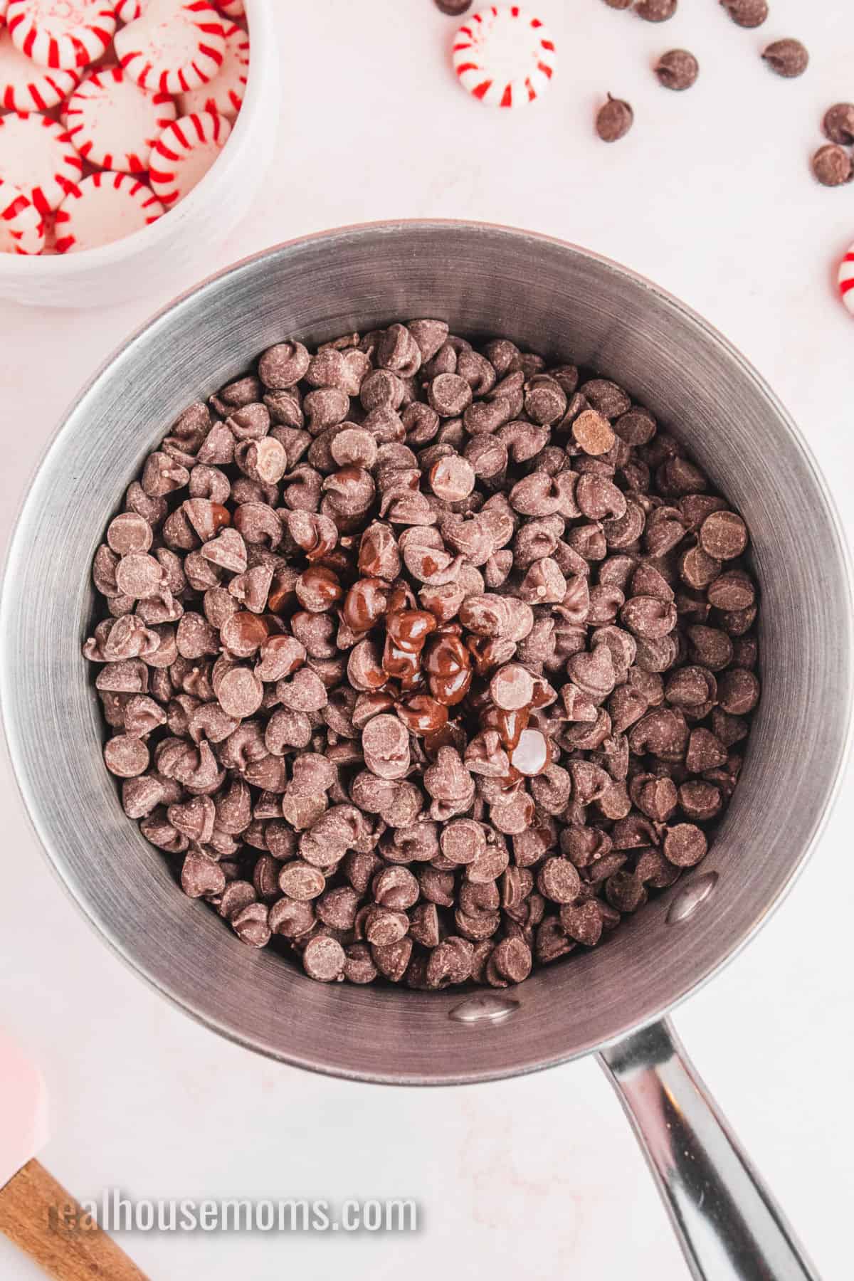 - To a heavy-bottom medium saucepan, add the sweetened condensed milk, chocolate chips, and peppermint extract. Place over medium-low heat. (Do not use high heat or you may burn your fudge!)