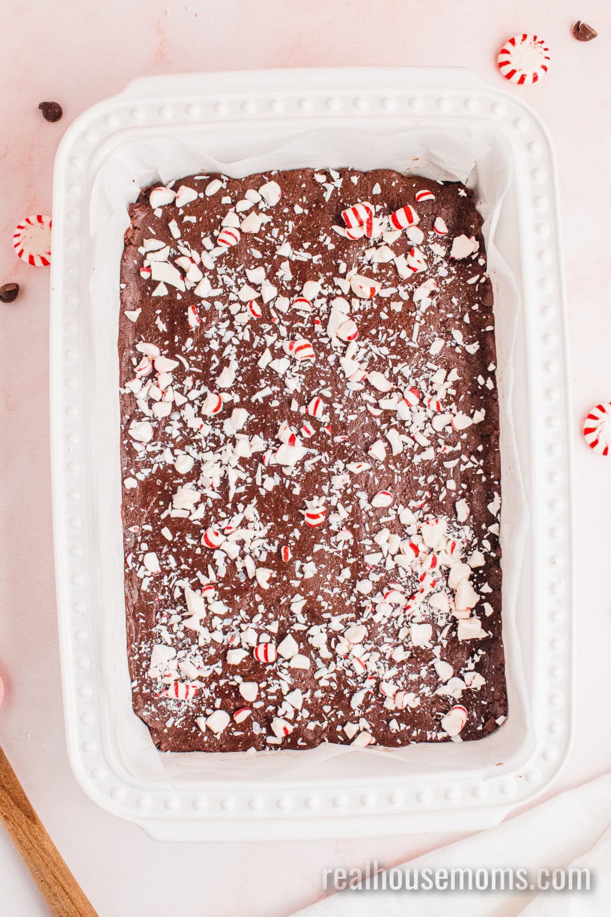 STEP ONE: Line an 11×7 glass baking dish with parchment paper and set aside. Place the peppermints into a zip-top bag and crush with a rolling pin or meat mallet. Set aside.