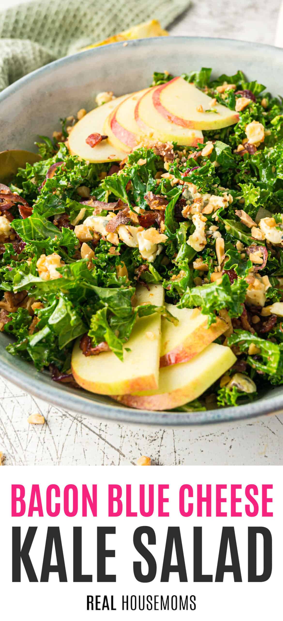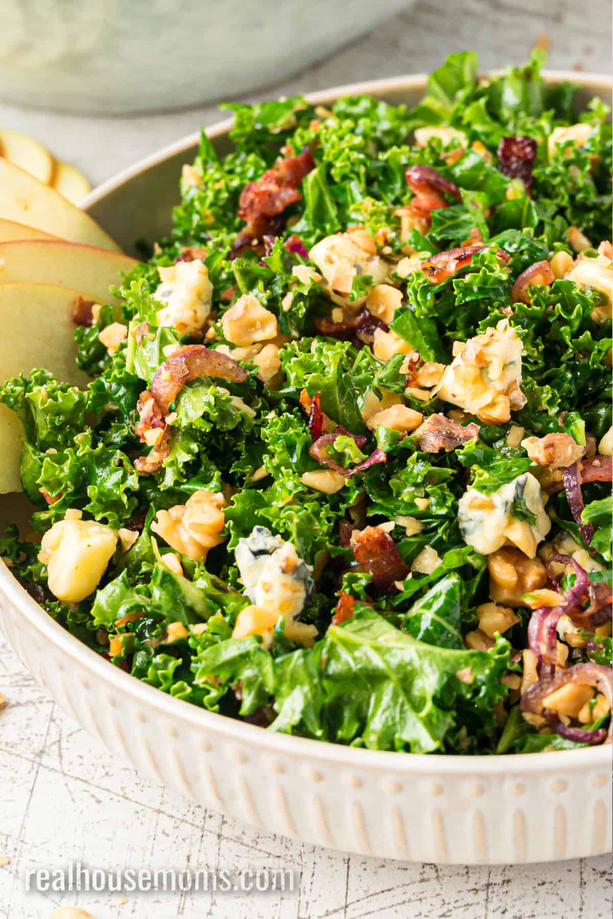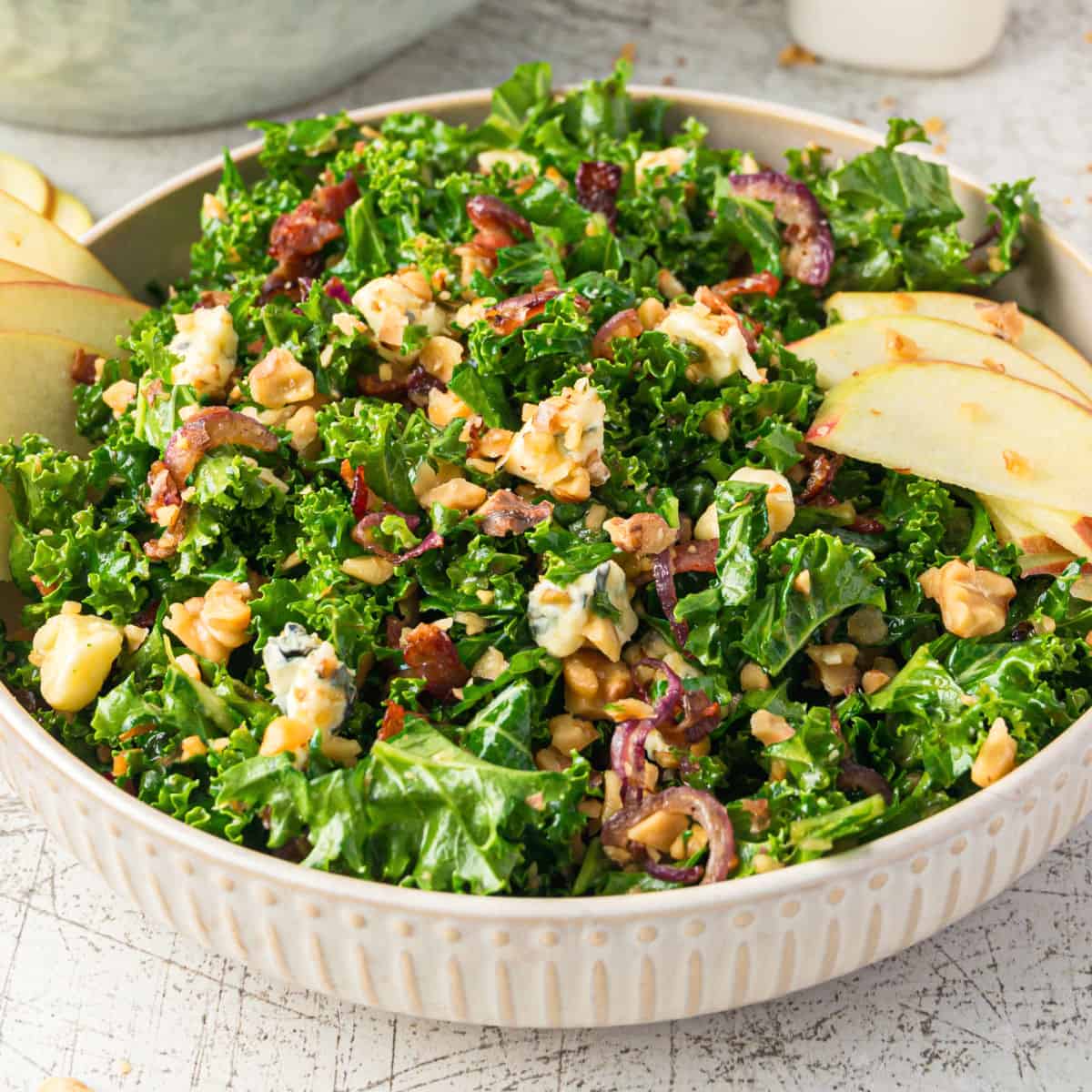 When the occasion calls for a beautiful salad recipe that’s bursting with bold flavor, make this simple, easy Bacon Blue Cheese Kale Salad! Shredded kale; savory, crisp bacon; tasty toasted walnuts; sweet slices of apple; caramelized red onion; and robust bleu cheese drizzled with a tangy balsamic vinaigrette – this salad screams “scrumptious!”