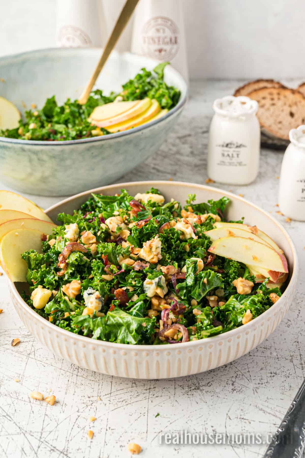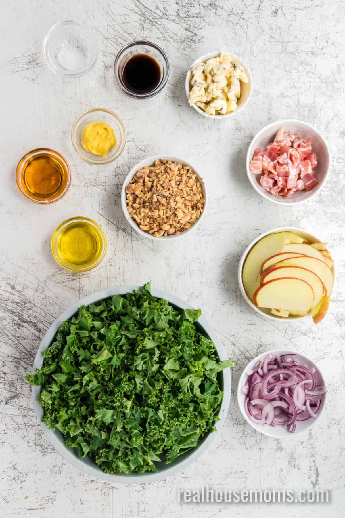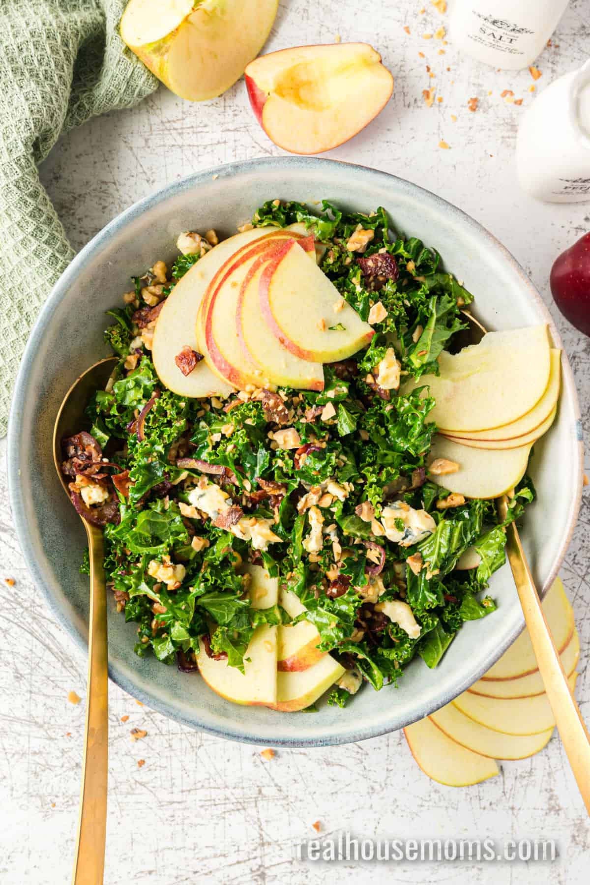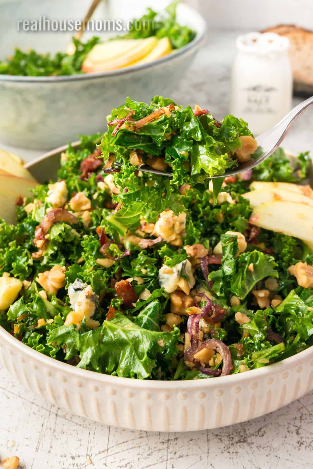 When the occasion calls for a beautiful salad recipe that’s bursting with bold flavor, make this simple, easy Bacon Blue Cheese Kale Salad! Shredded kale; savory, crisp bacon; tasty toasted walnuts; sweet slices of apple; caramelized red onion; and robust bleu cheese drizzled with a tangy balsamic vinaigrette – this salad screams “scrumptious!”