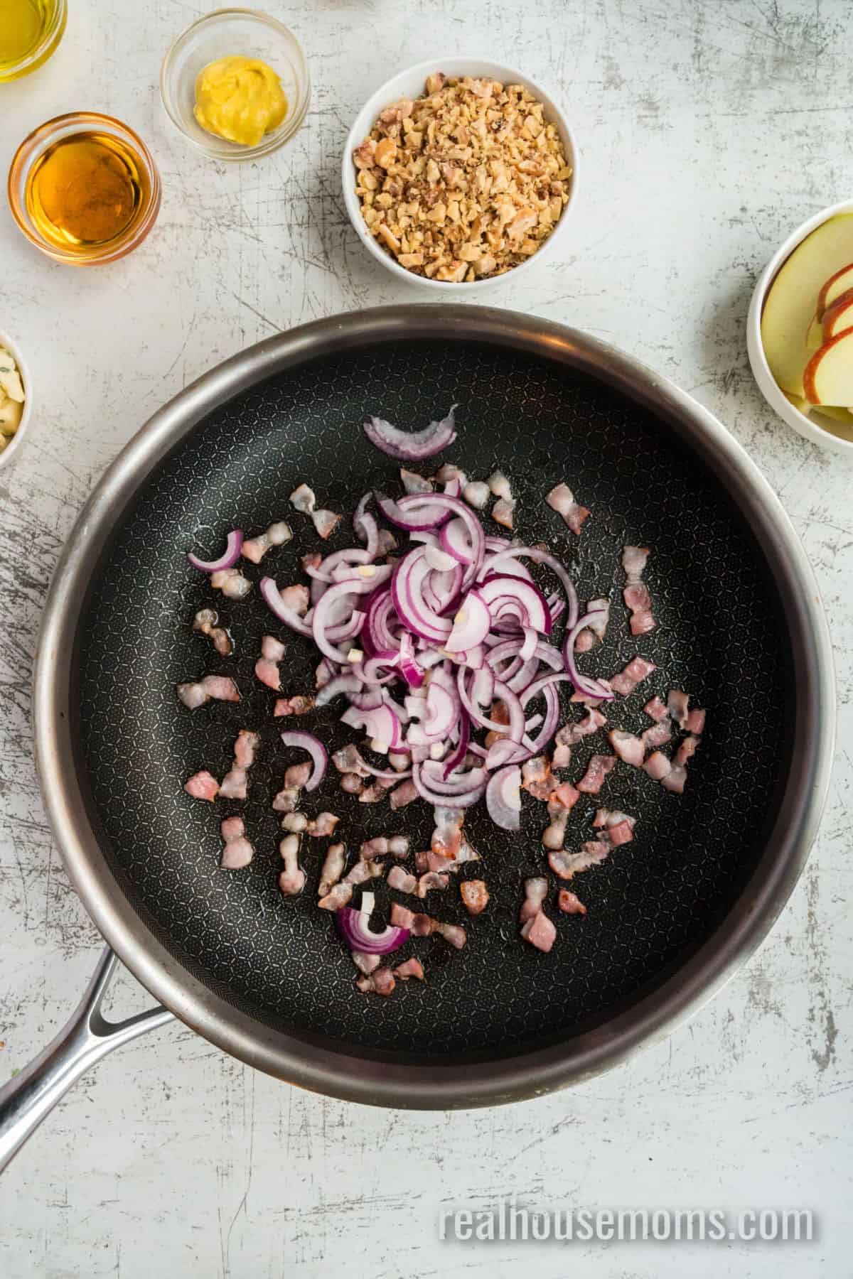 - Add the sliced bacon to a large skillet over medium heat. Once the fat begins to render from the bacon, add the red onion. Continue to cook, stirring occasionally, until the bacon is crispy and the onion is soft, about 10 minutes. Drain any excess fat from the pan.