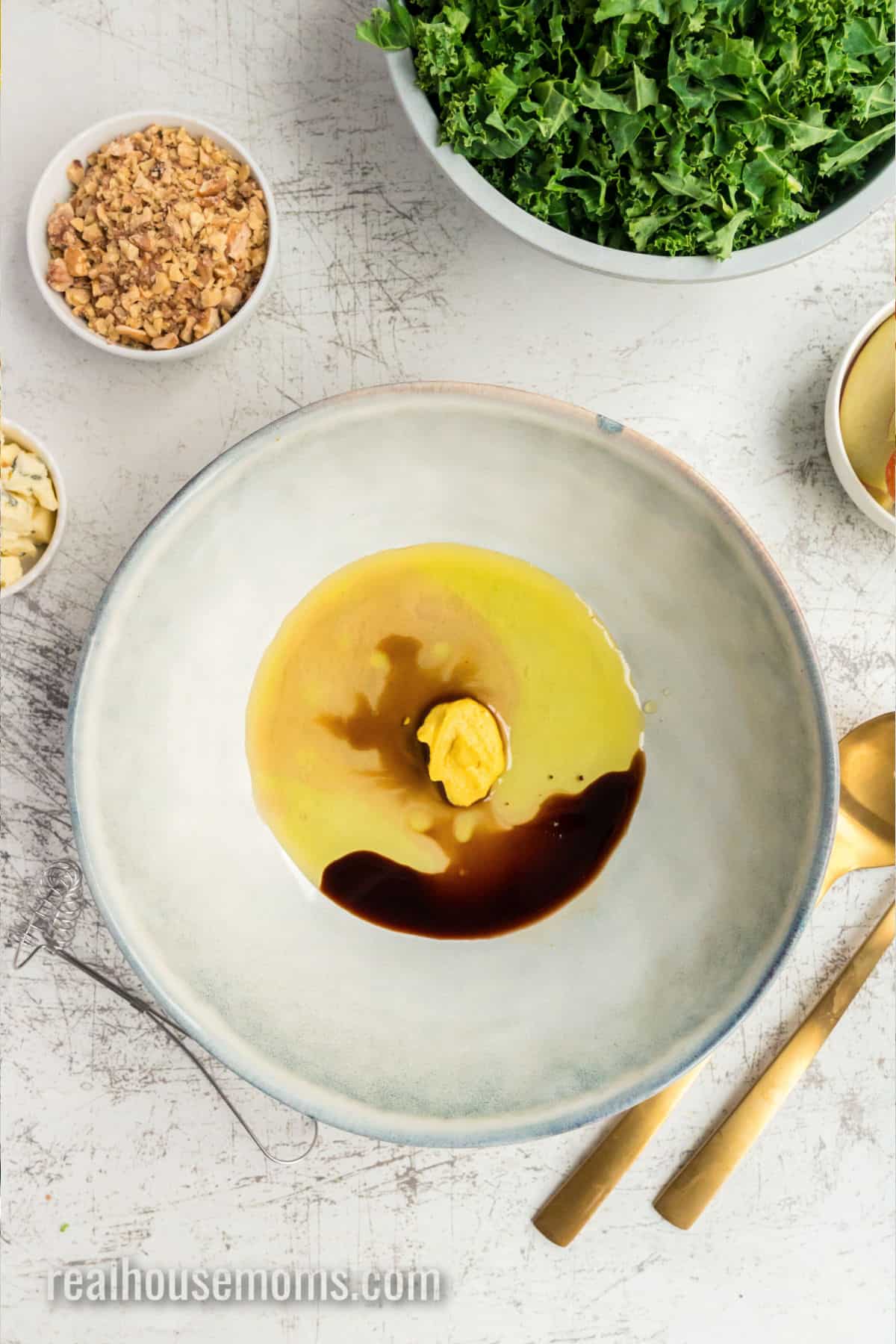 - While the onions cook, whisk together the dressing ingredients in a large serving bowl until they are smooth and creamy.