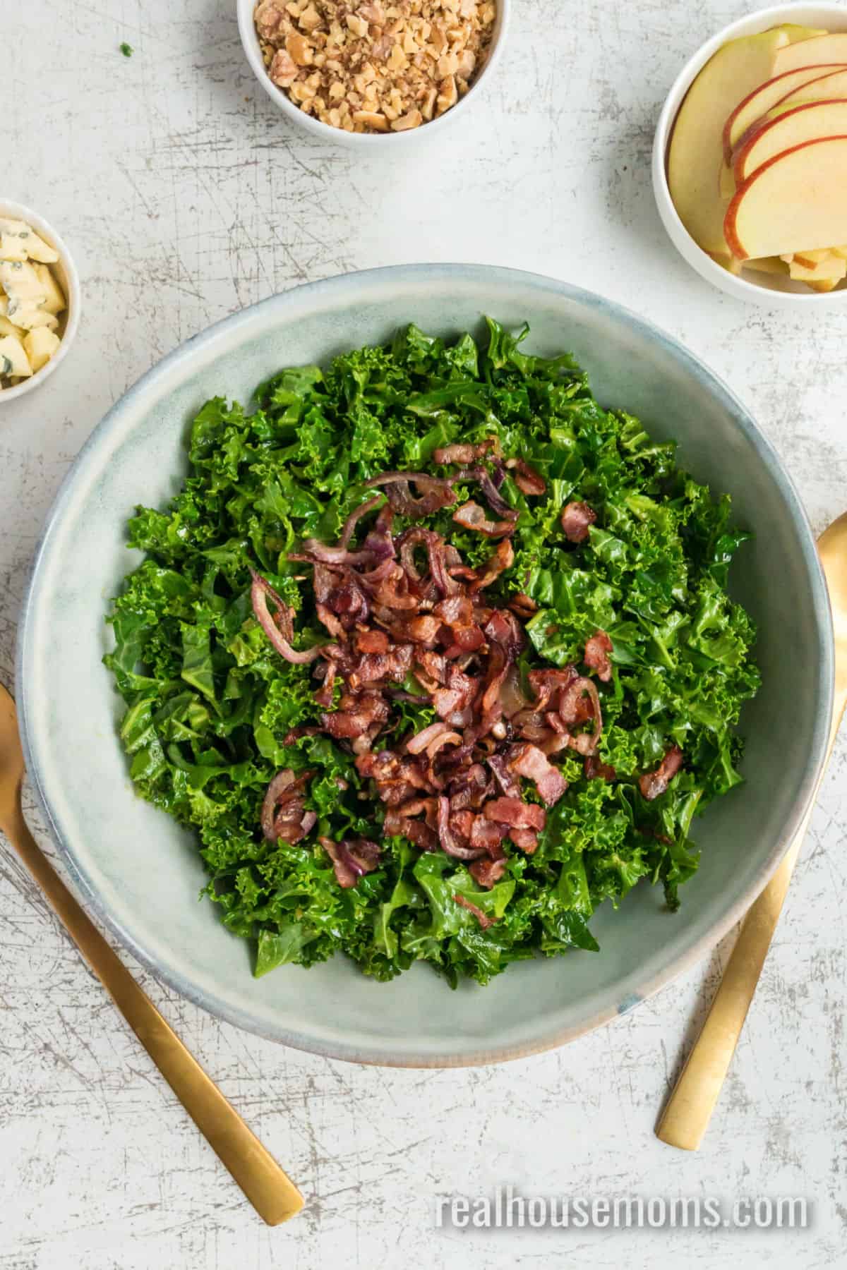 - Add the kale to the serving bowl and toss to coat. Once the bacon and onions have finished cooking, let them cool for 1 minute. Then, add them to the bowl with the kale.