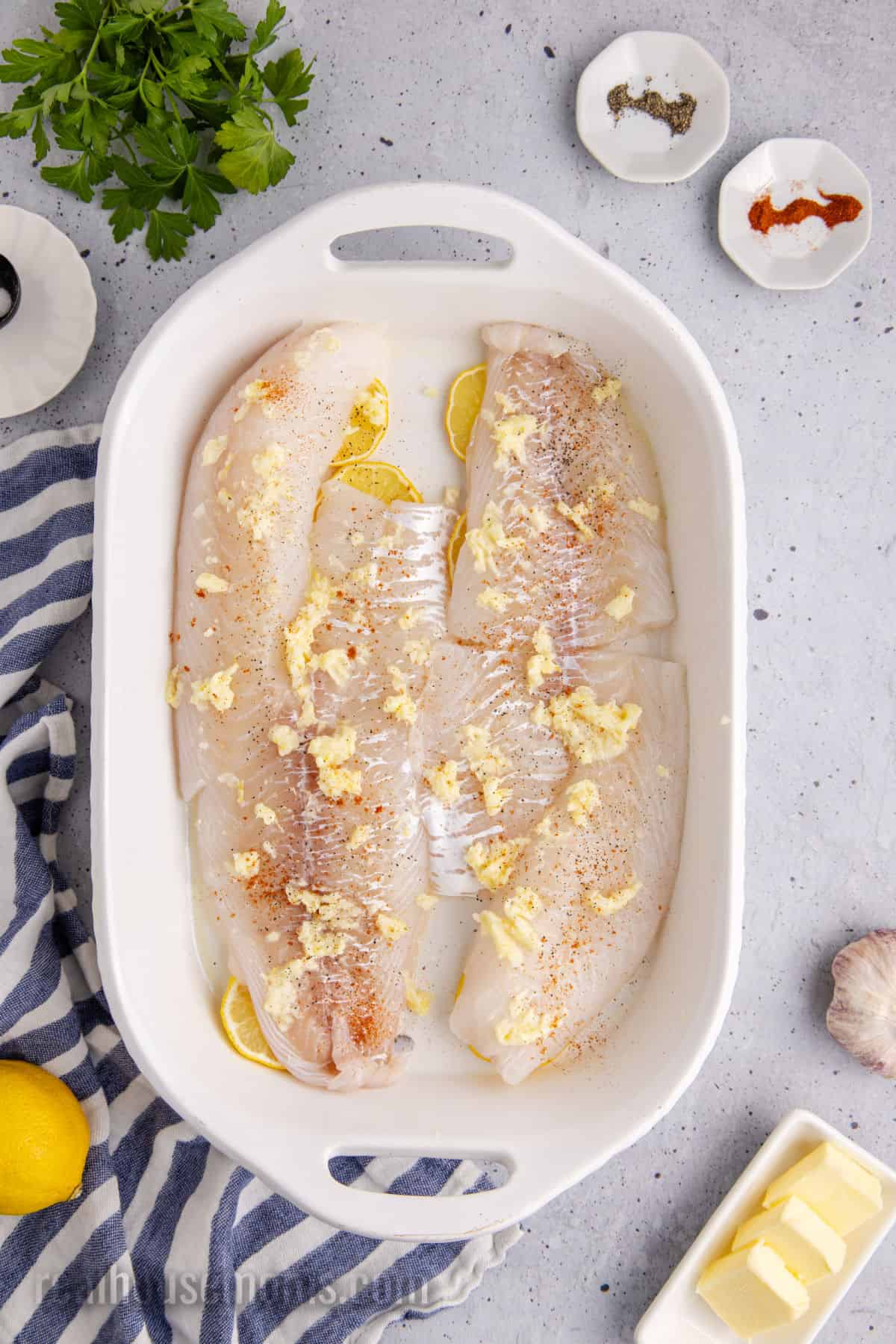 STEP TWO: In a small bowl, add very soft (but NOT melted) butter, garlic, lemon zest, 1/2 tablespoon of lemon juice, and salt. Mix well. Rub the butter all over the fish filets, then sprinkle the tops with paprika and ground pepper.