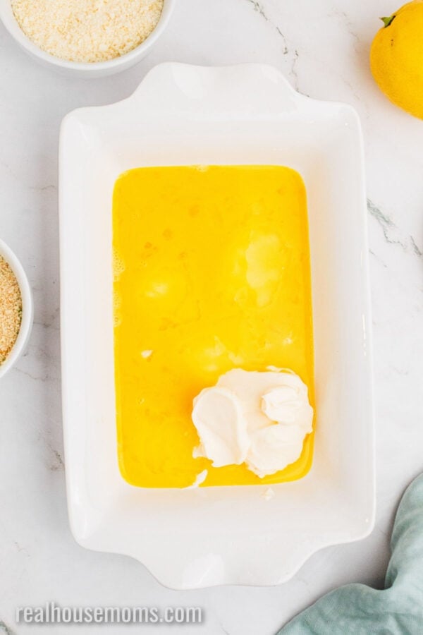 STEP ONE: Preheat the oven to 400°F and spray the baking dish (or dishes) with cooking spray. In a shallow bowl, beat two eggs, then stir in the mayo and lemon juice. In a second shallow bowl, add the breadcrumbs, parmesan, and seasonings. Mix well.
