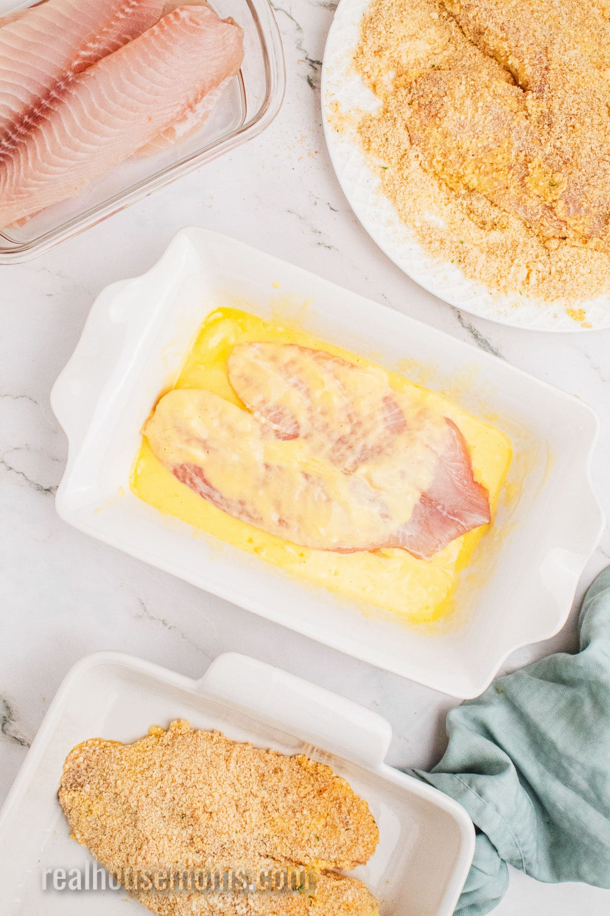 STEP TWO: Dip one filet in the egg mixture, coating thoroughly. Then dredge it through the breadcrumb mixture, ensuring both sides are evenly covered. Lay the filet into the casserole dish. Repeat until all the filets are done.