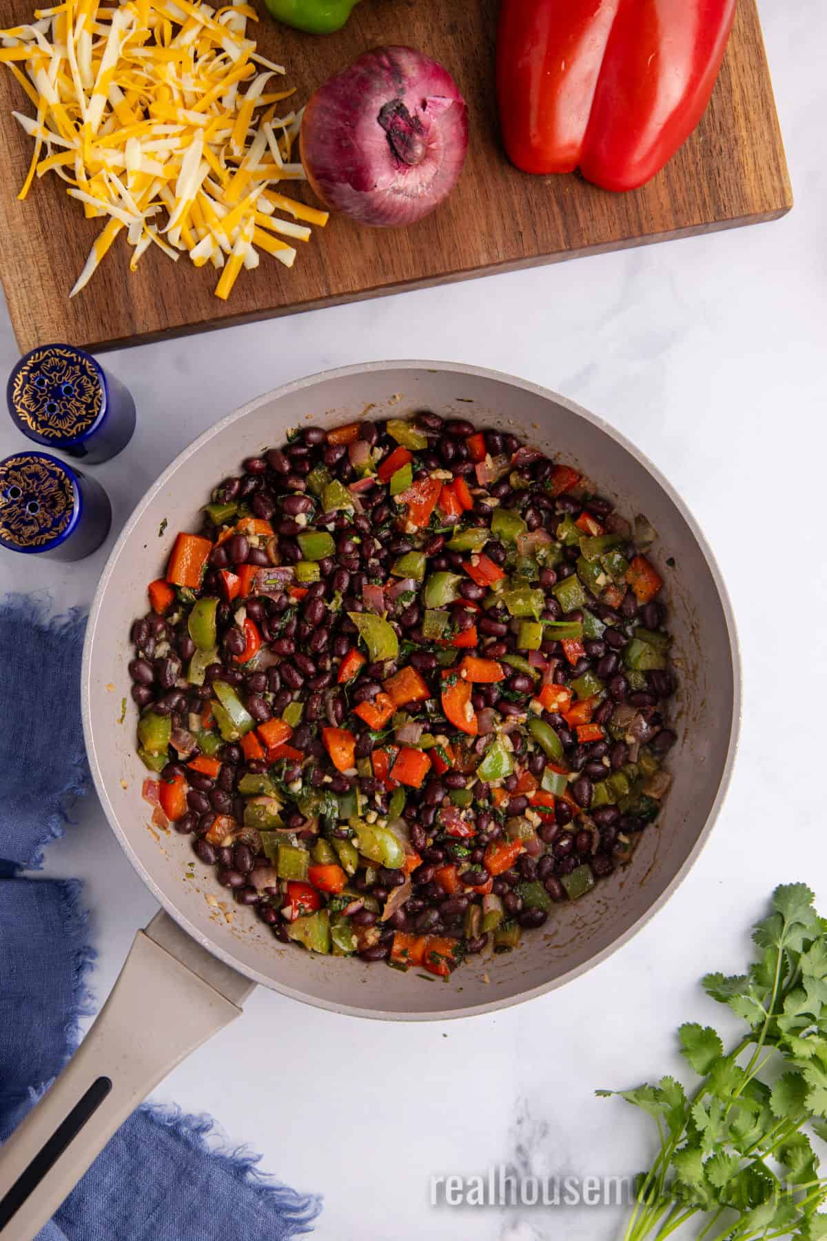 - Add the black beans, cilantro, cumin, salt, and pepper, and stir to combine. Cook for 1-2 minutes. Pour in the lime juice and simmer until the liquid is cooked down. Remove from the heat and set aside.