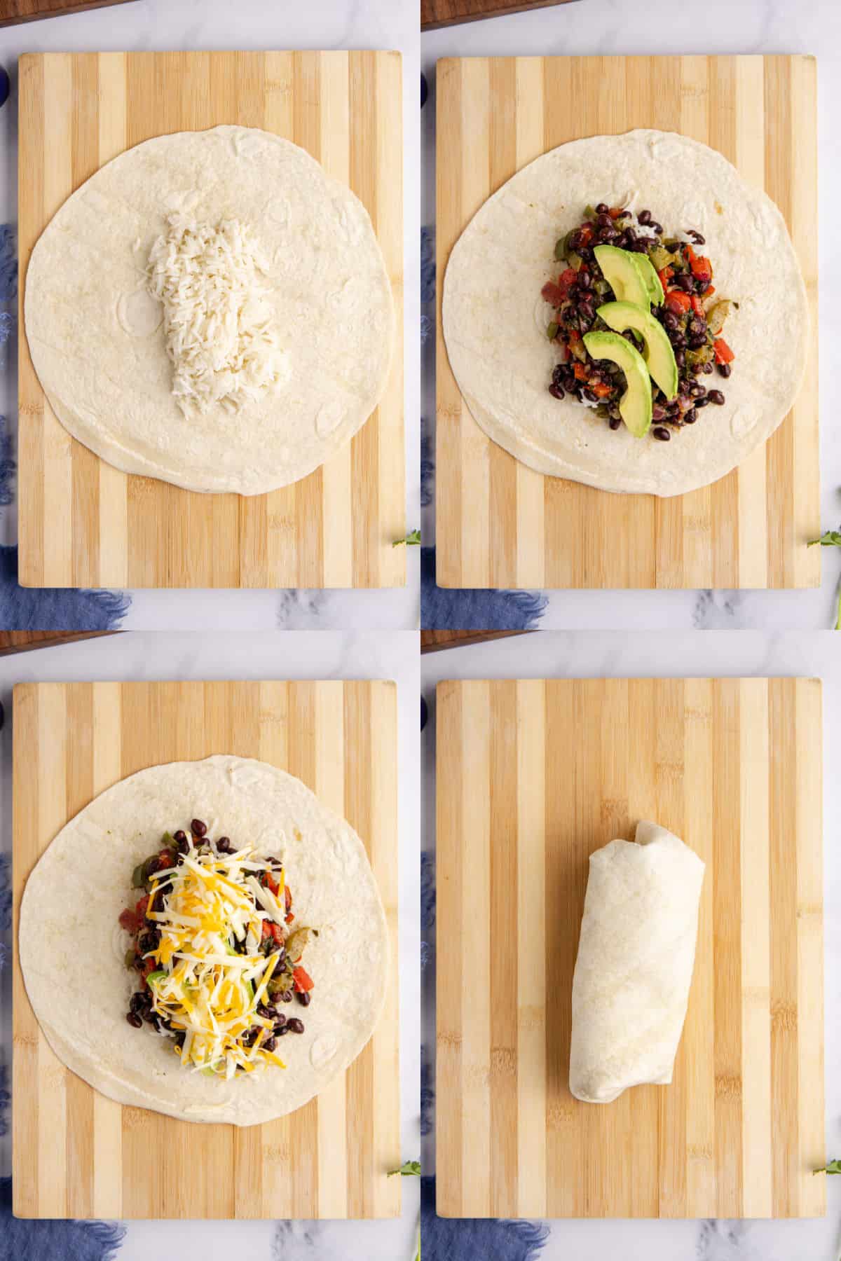 - Assemble the burritos by adding 1/2 cup of cooked rice to the center of each tortilla and forming it into a flat rectangle. Add half of the bean mixture, avocado slices, and cheese to each burrito. Fold in the side and then wrap tightly.