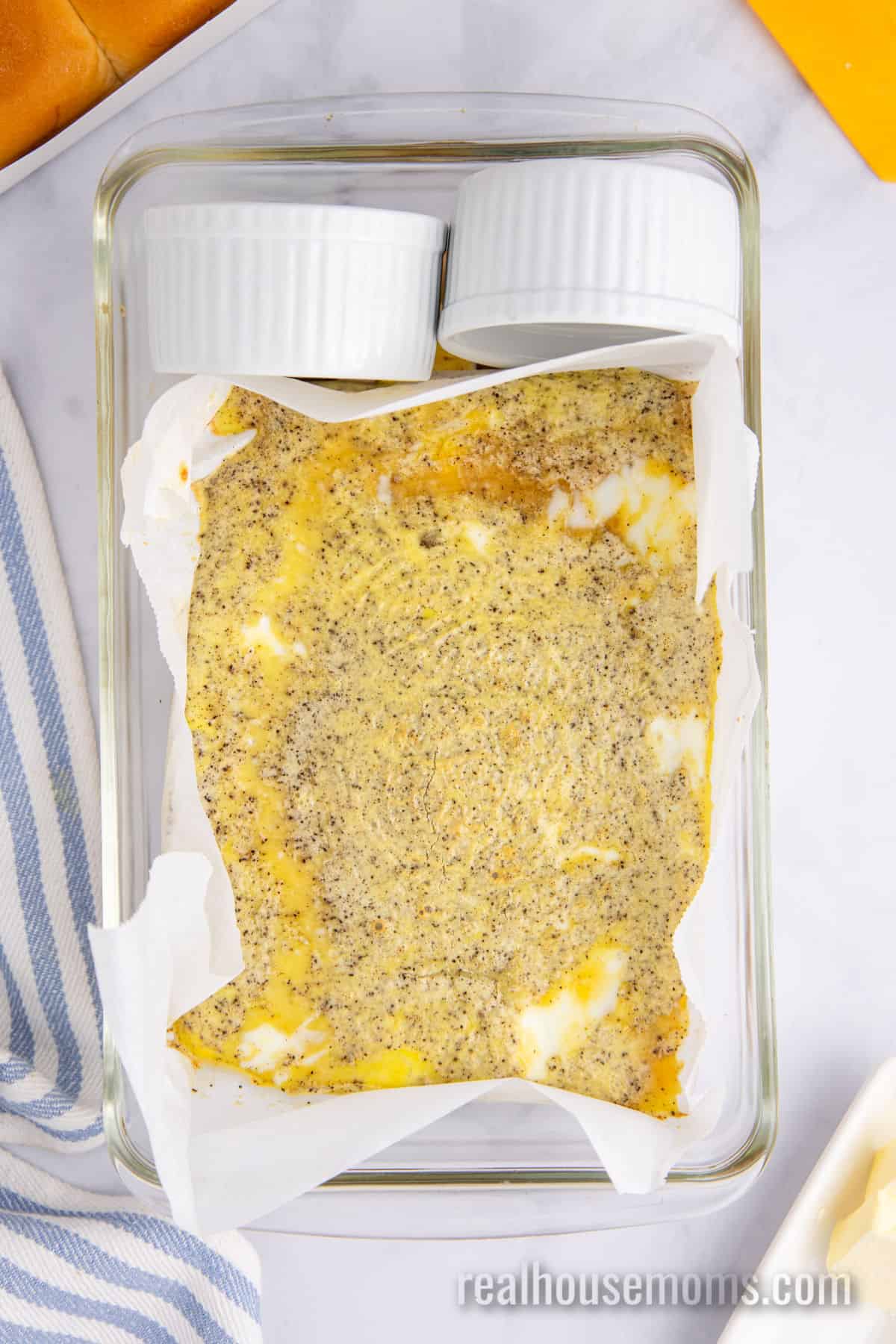 - If you don’t have a 7×11 baking dish, you can use a 9×13 dish and a couple of ramekins to create a smaller well with parchment paper.