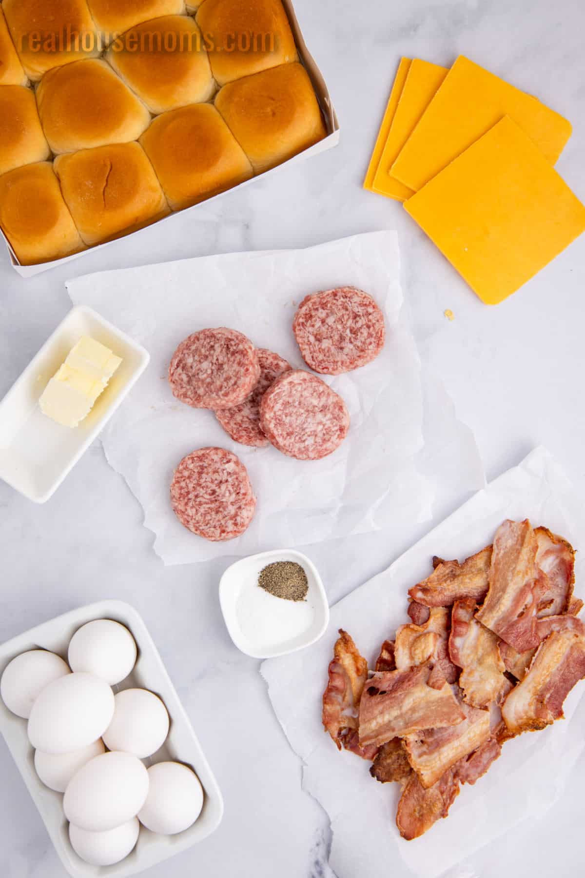 - Place the bottom half of the rolls onto a parchment paper-lined baking sheet. Top with the eggs, then the bacon, crumbled sausage, and sliced cheese. (The cheese goes on top so it melts and holds everything together.) Place the top buns over the slider filling. Brush the top with melted butter.