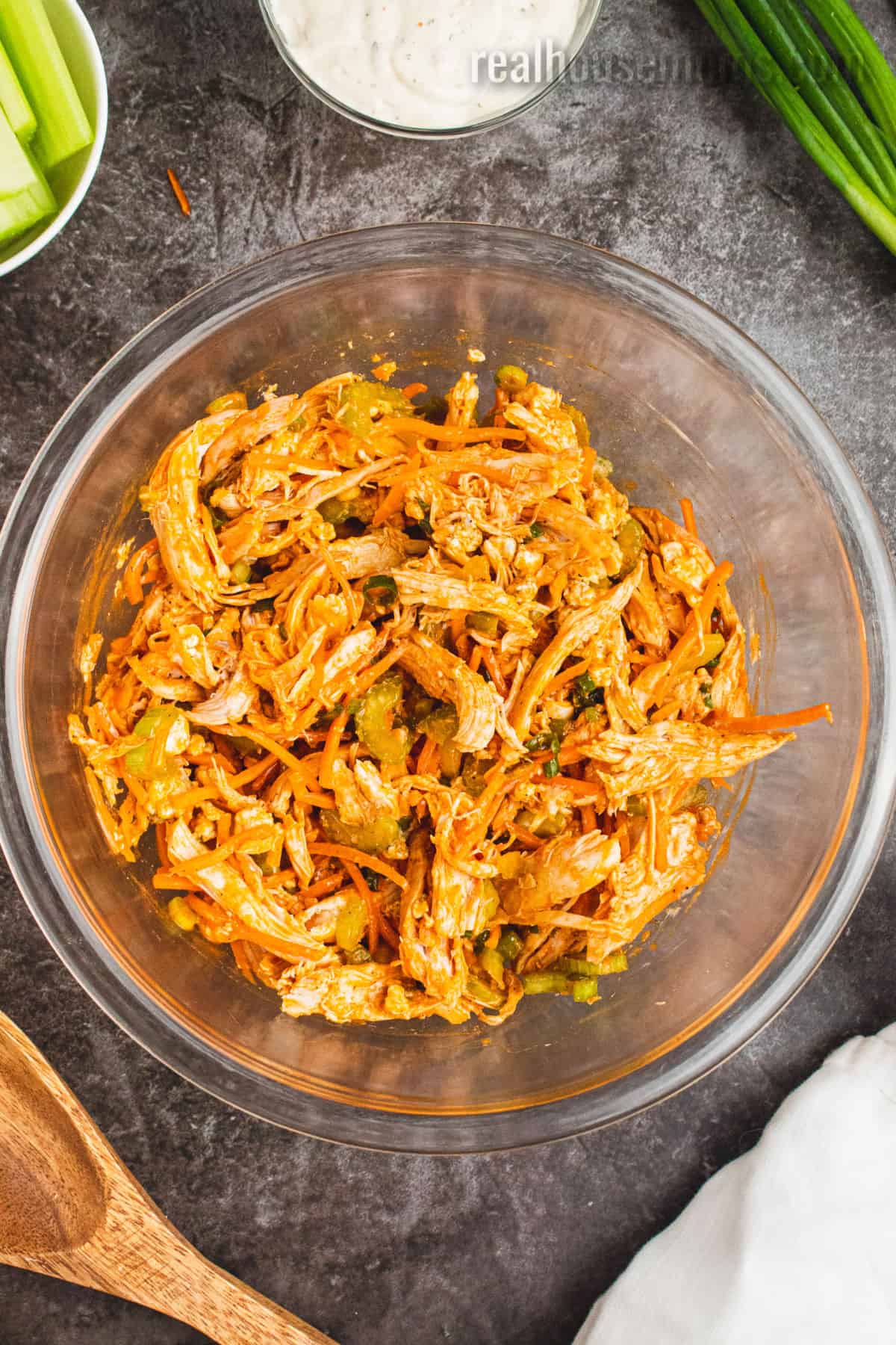 Seasoning: We’re adding just a touch of sugar and pepper to the chicken mixture to balance the tanginess of the buffalo sauce and blue cheese.