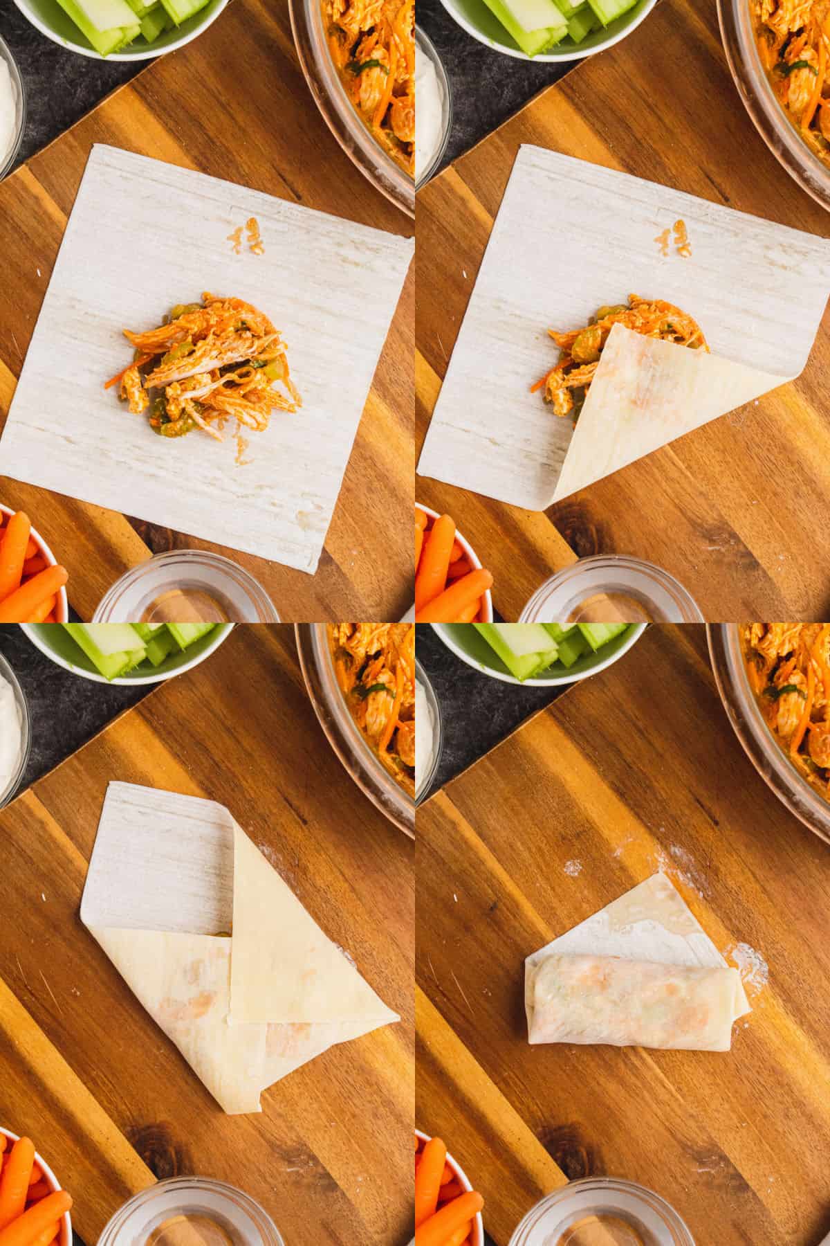 - Fold up bottom corner over filling, pull in the two sides and then roll to the top point of the wrapper.