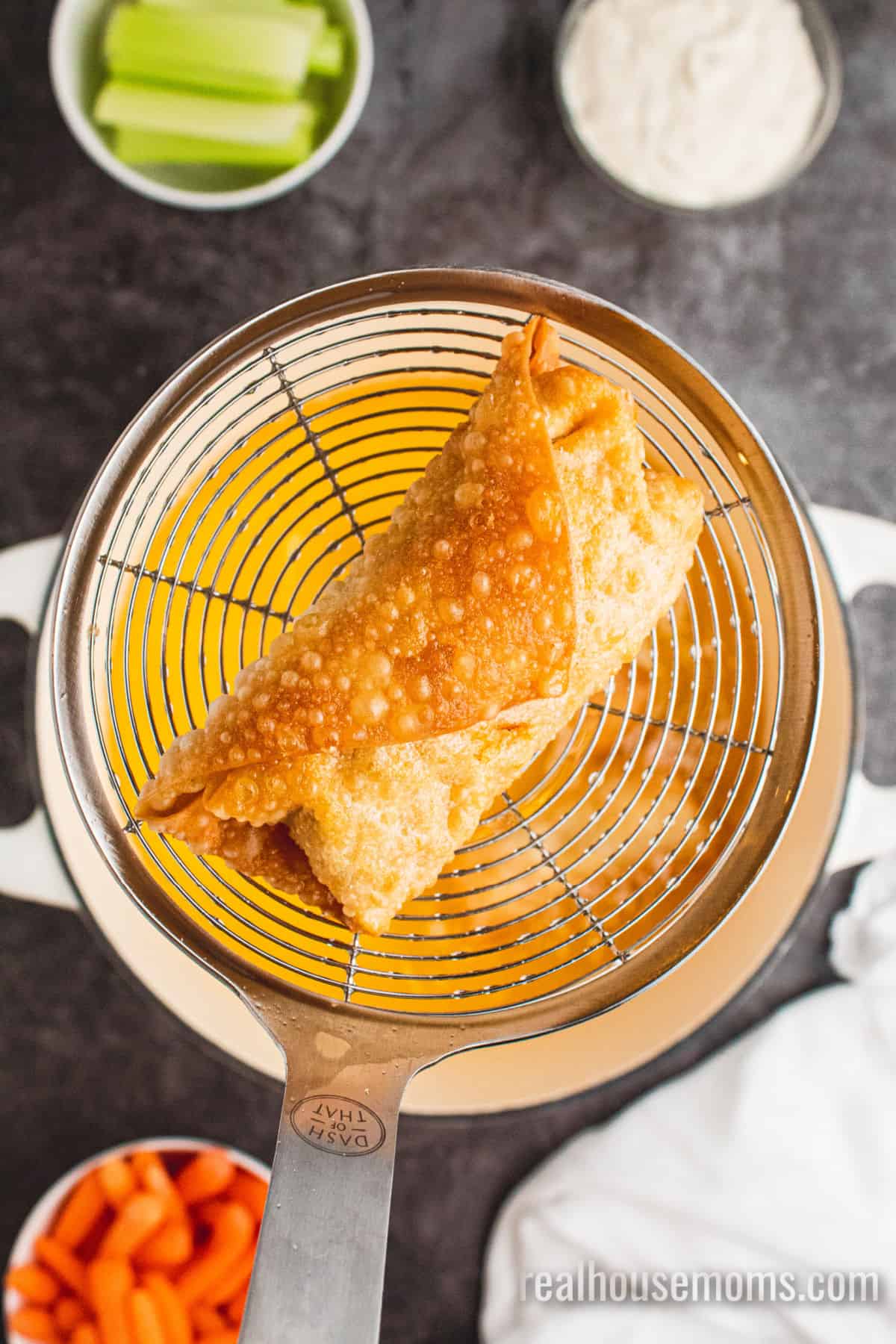 - Surprisingly, peanut oil is an excellent oil for frying Buffalo Chicken Egg Rolls.