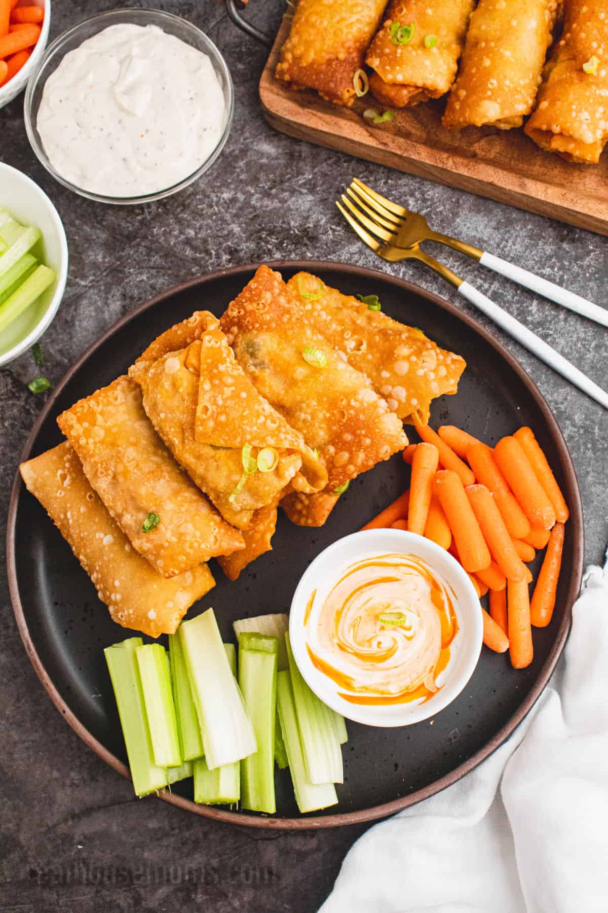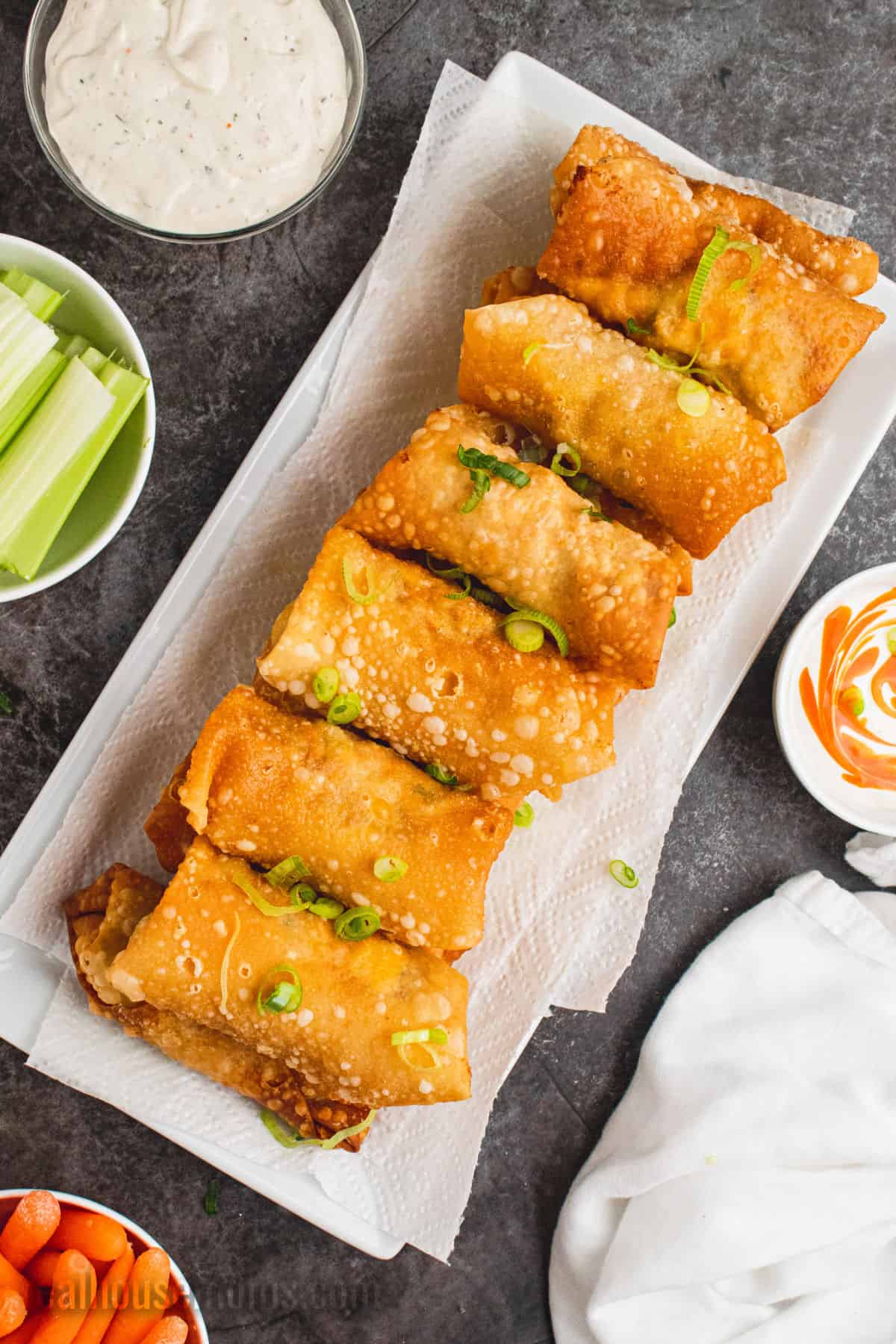 STEP FIVE: When both sides are golden, remove from the pan and place on a paper-towel-lined plate to drain. Repeat until all the Buffalo Egg Rolls are cooked. Serve with your favorite dressing and enjoy!