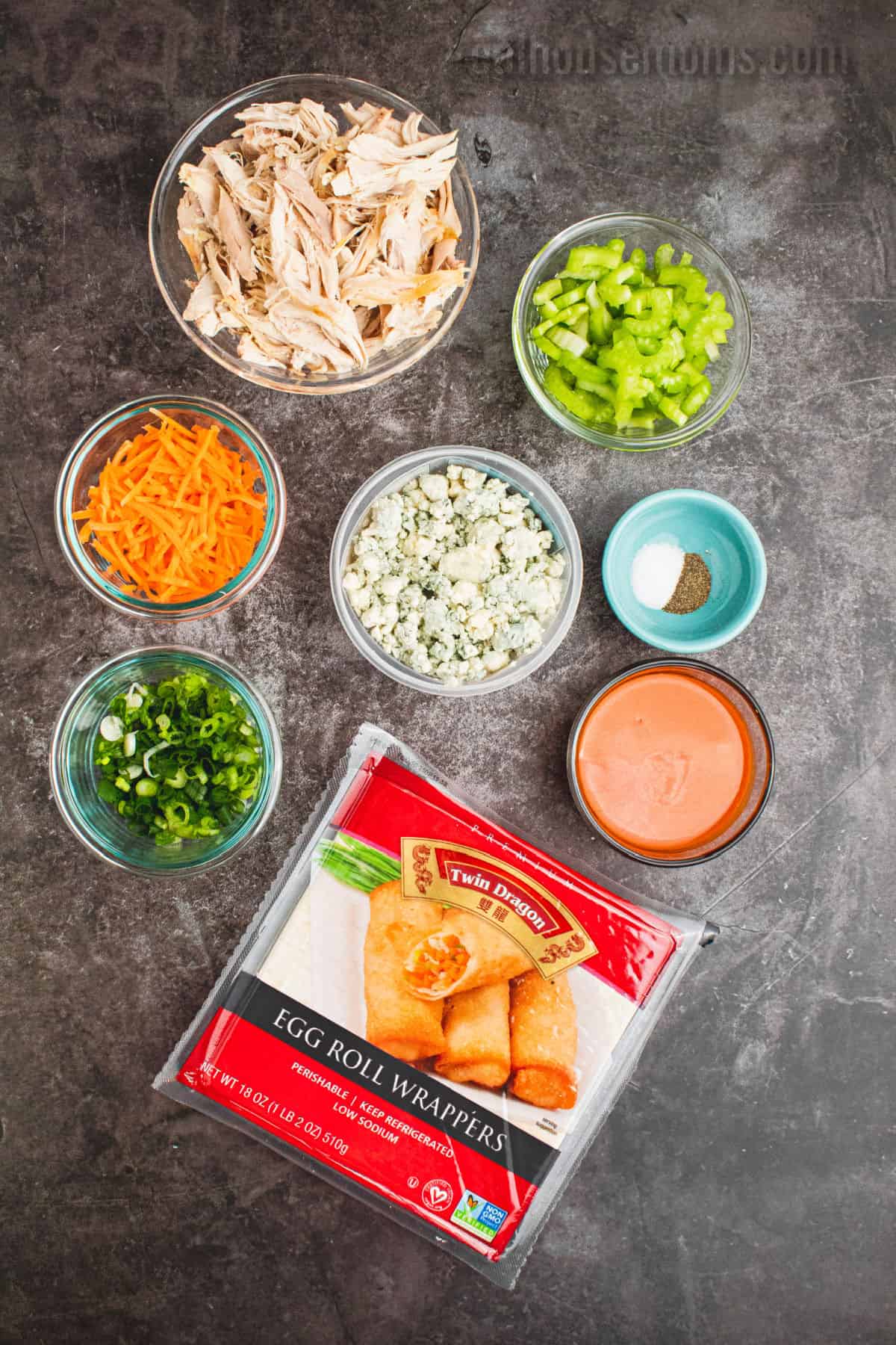 All the goodness of Buffalo chicken wings without the bones and without the mess! Our Buffalo Chicken Egg Rolls are crispity, crunchity satisfying bites of appetizer heaven! At just over 100 calories each, these egg roll wrappers are filled with chicken, carrots, green onions, celery, and blue cheese, then pan-fried to a golden-brown perfection!
