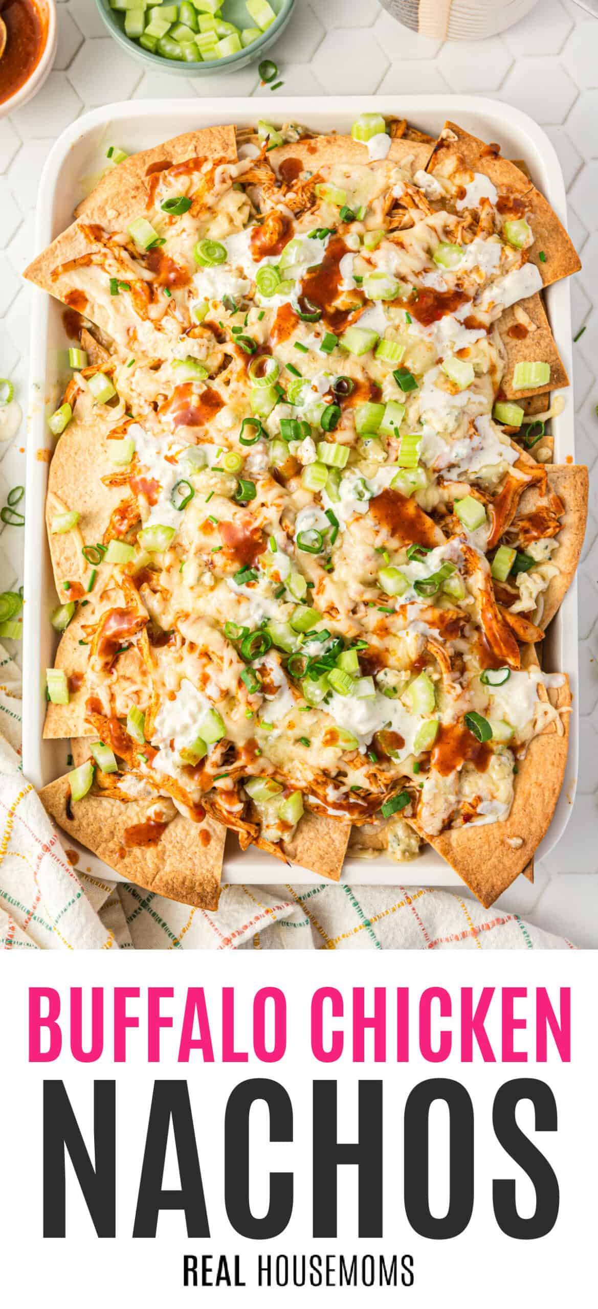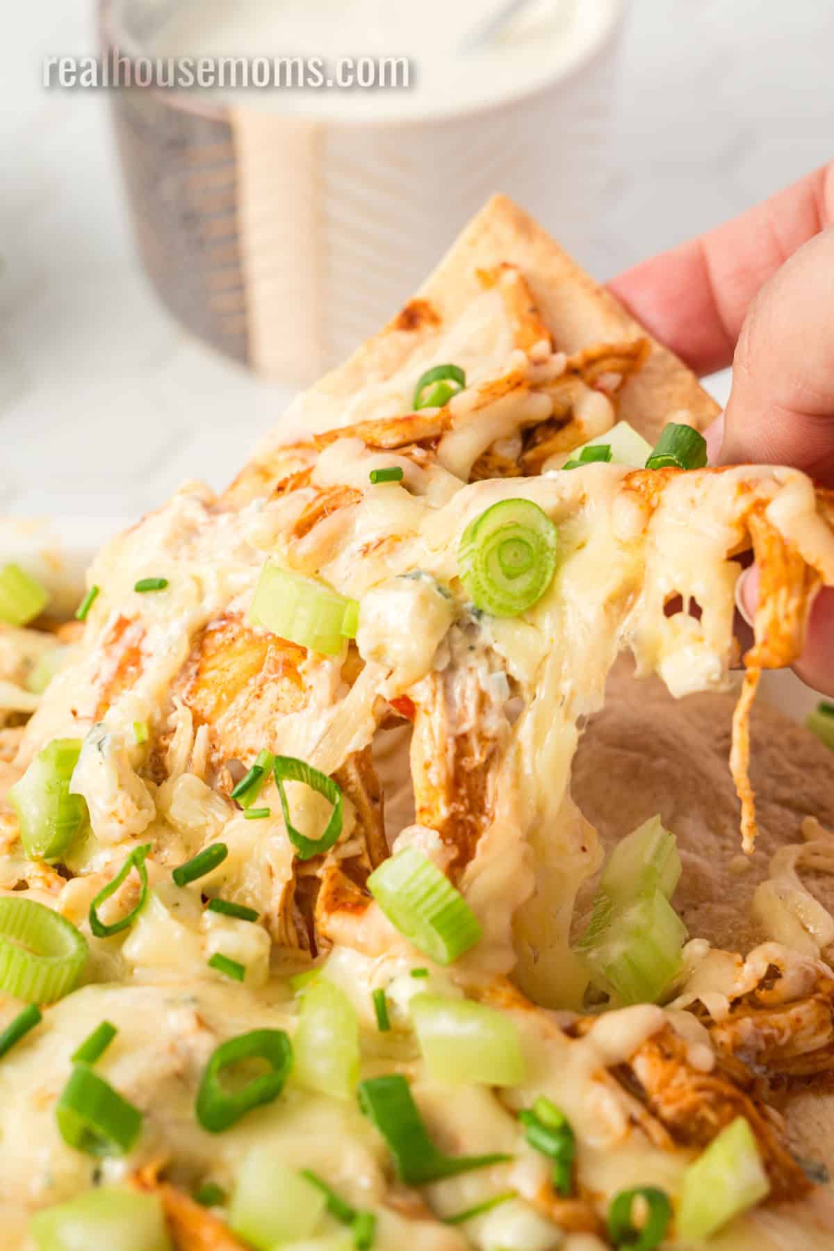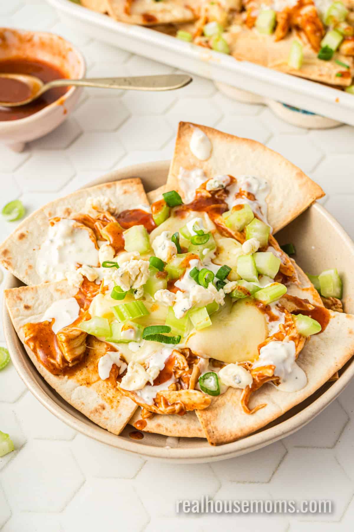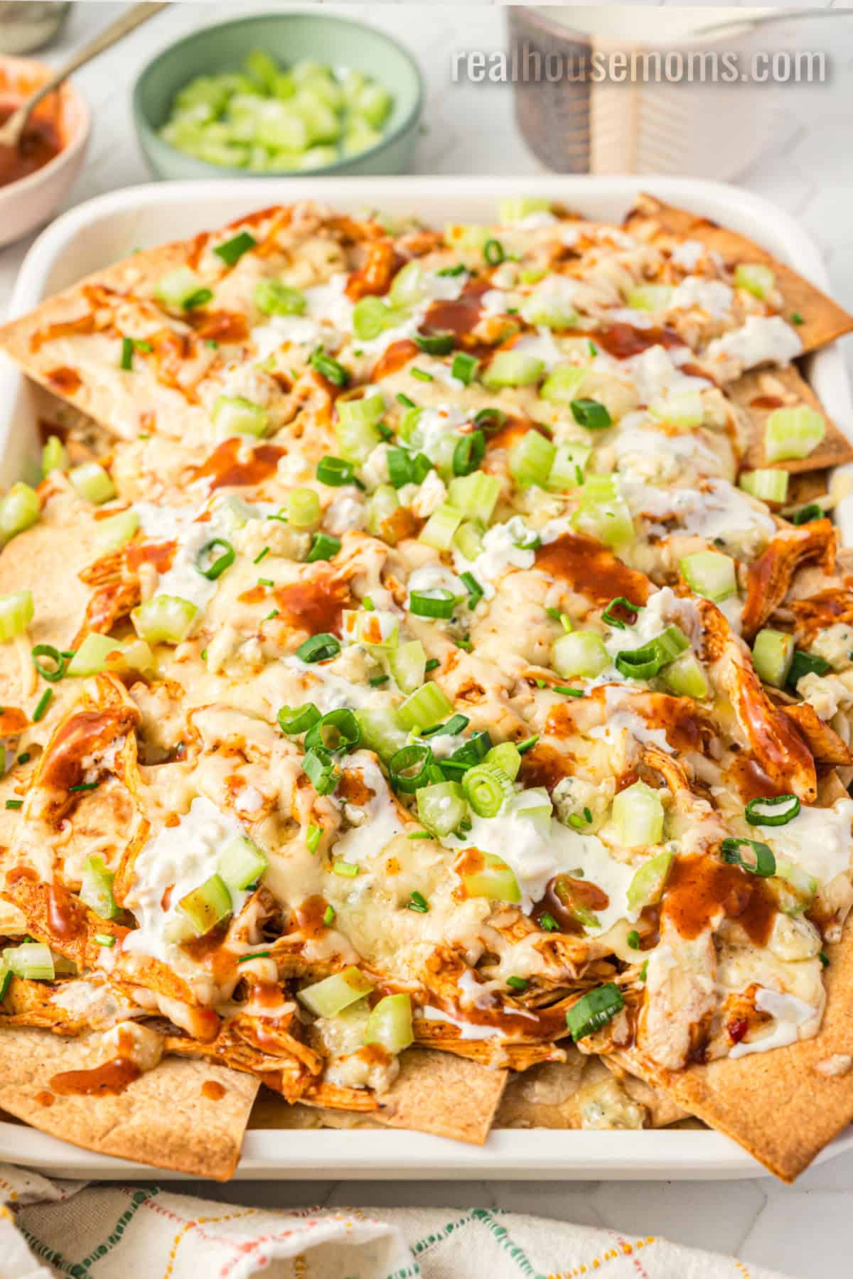 When it comes to finger foods, it’s hard to top nachos or Buffalo chicken wings, so we combined them into one unbeatable appetizer! The “make your own” tortilla chips are a true game-changer here! We use soft tortillas and bake them with olive oil and seasonings, so they’re thicker, crunchier, and tastier than store-bought chips, and they hold up to all the toppings without breaking or becoming soggy.