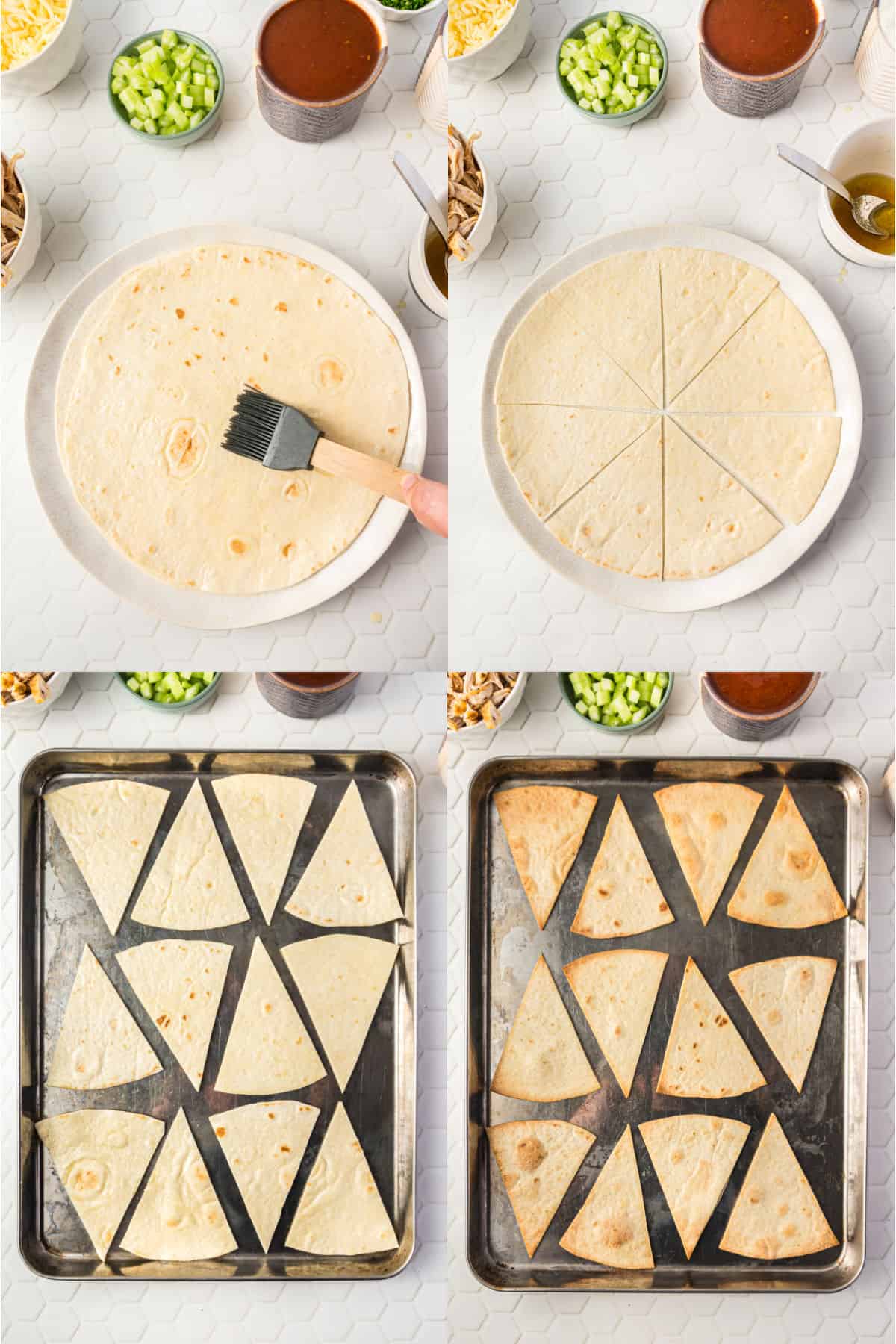 - Preheat the oven to 350 degrees F. Cut each tortilla into 8 wedges.