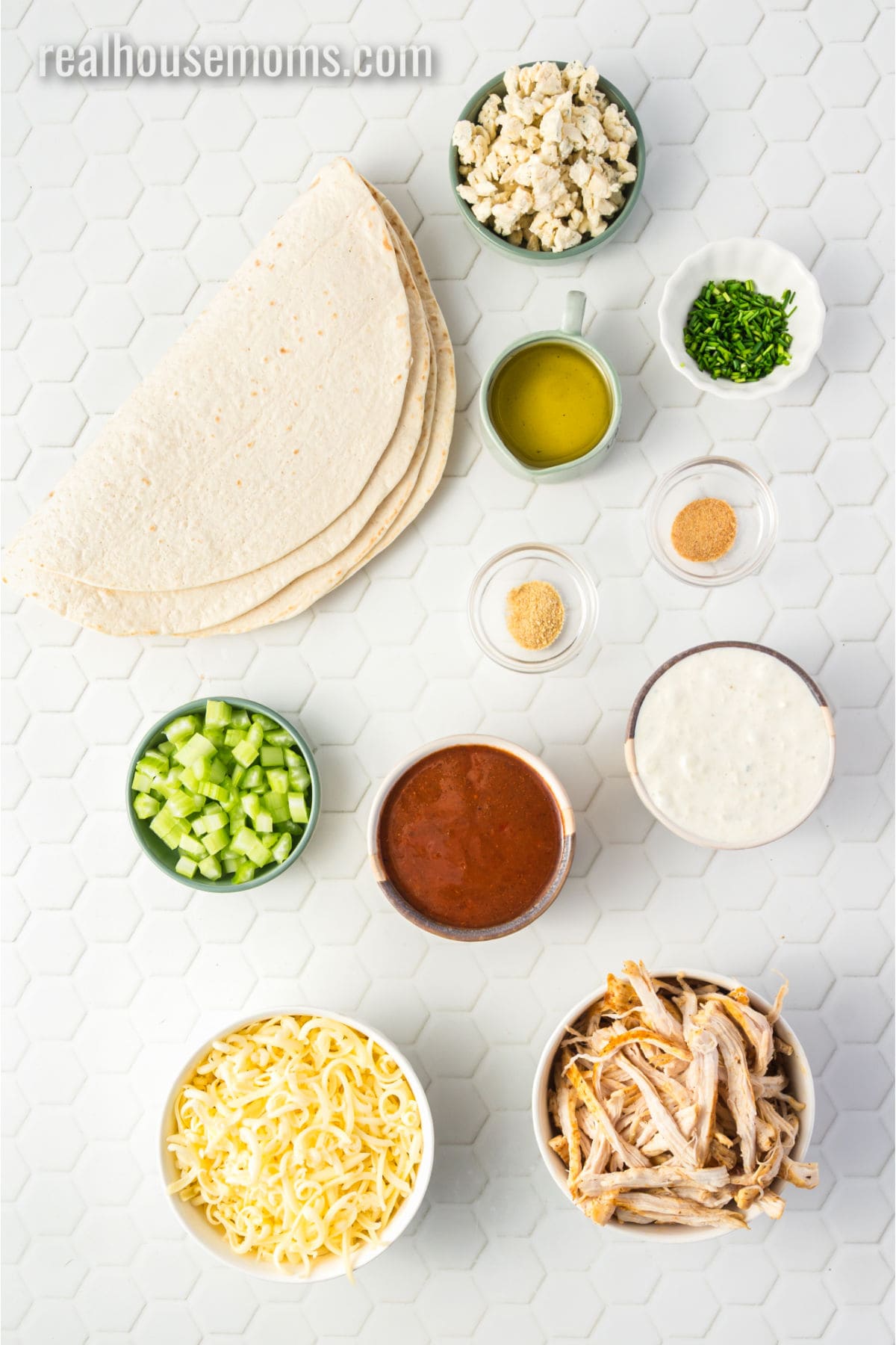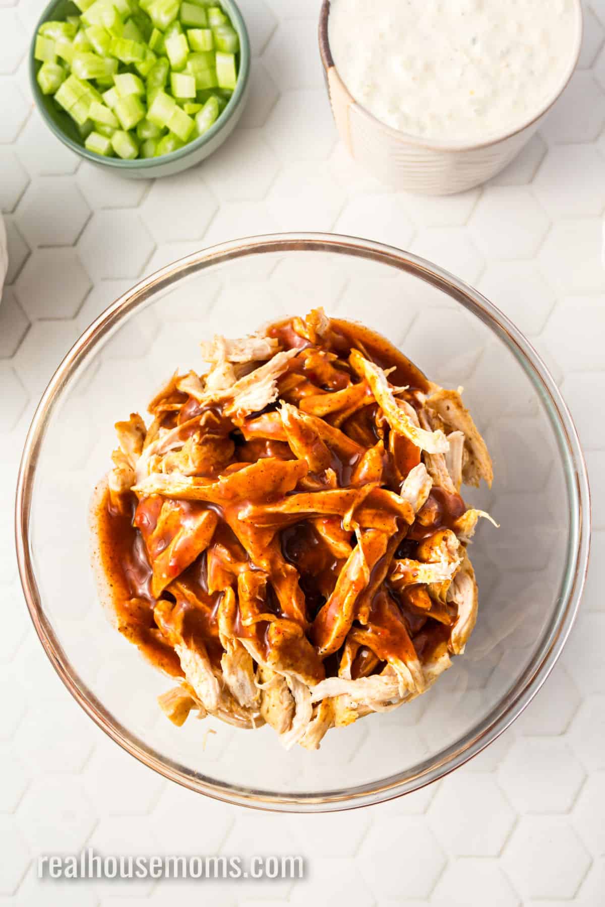 - Add the shredded chicken to a medium mixing bowl. Pour in the wing sauce and stir until evenly coated. Set aside.