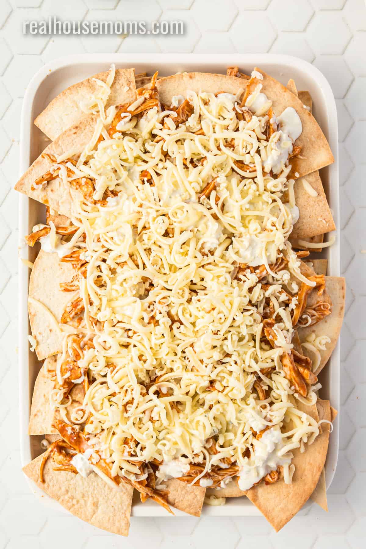 STEP THREE: When the chips are crispy and done, arrange half of them on a baking sheet (I use one of the pans used to make the chips). Top the chips with half of the buffalo chicken, blue cheese crumbles, and Monterey Jack cheese. Add the remaining chips over the cheese, then repeat the layers, substituting the blue cheese dressing for the crumbles this time. Bake for 8 to 10 minutes until the cheese is hot and melty.
