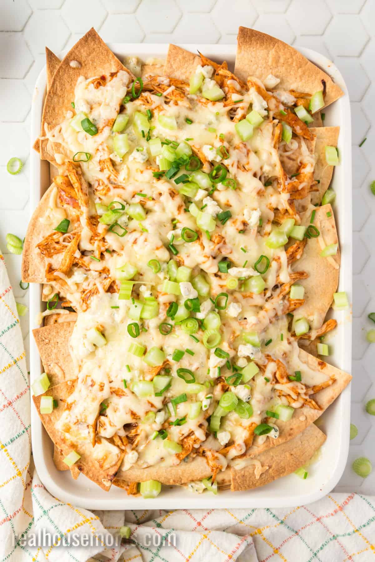 Toppings: After you layer the nachos on the sheet pan, top them with chives, crumbled bleu cheese, and diced celery!