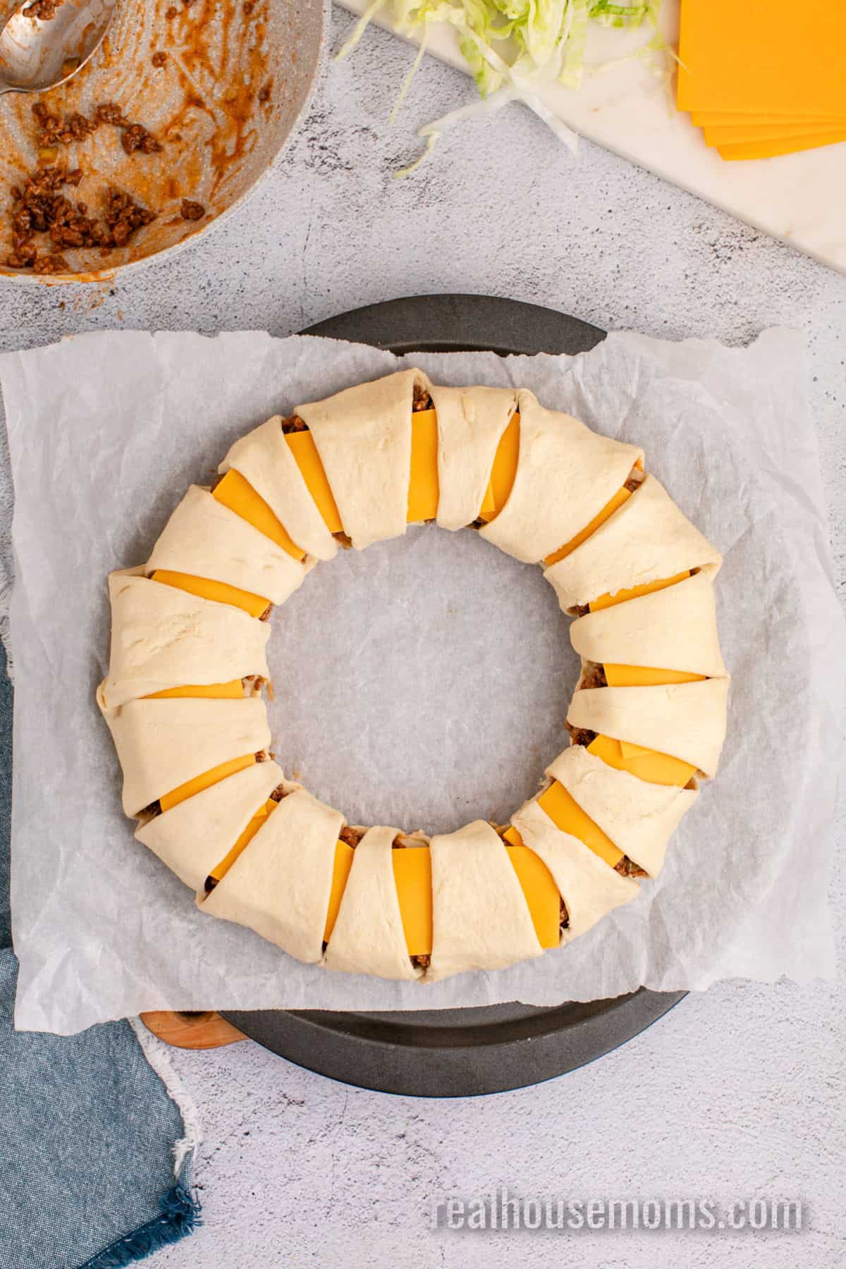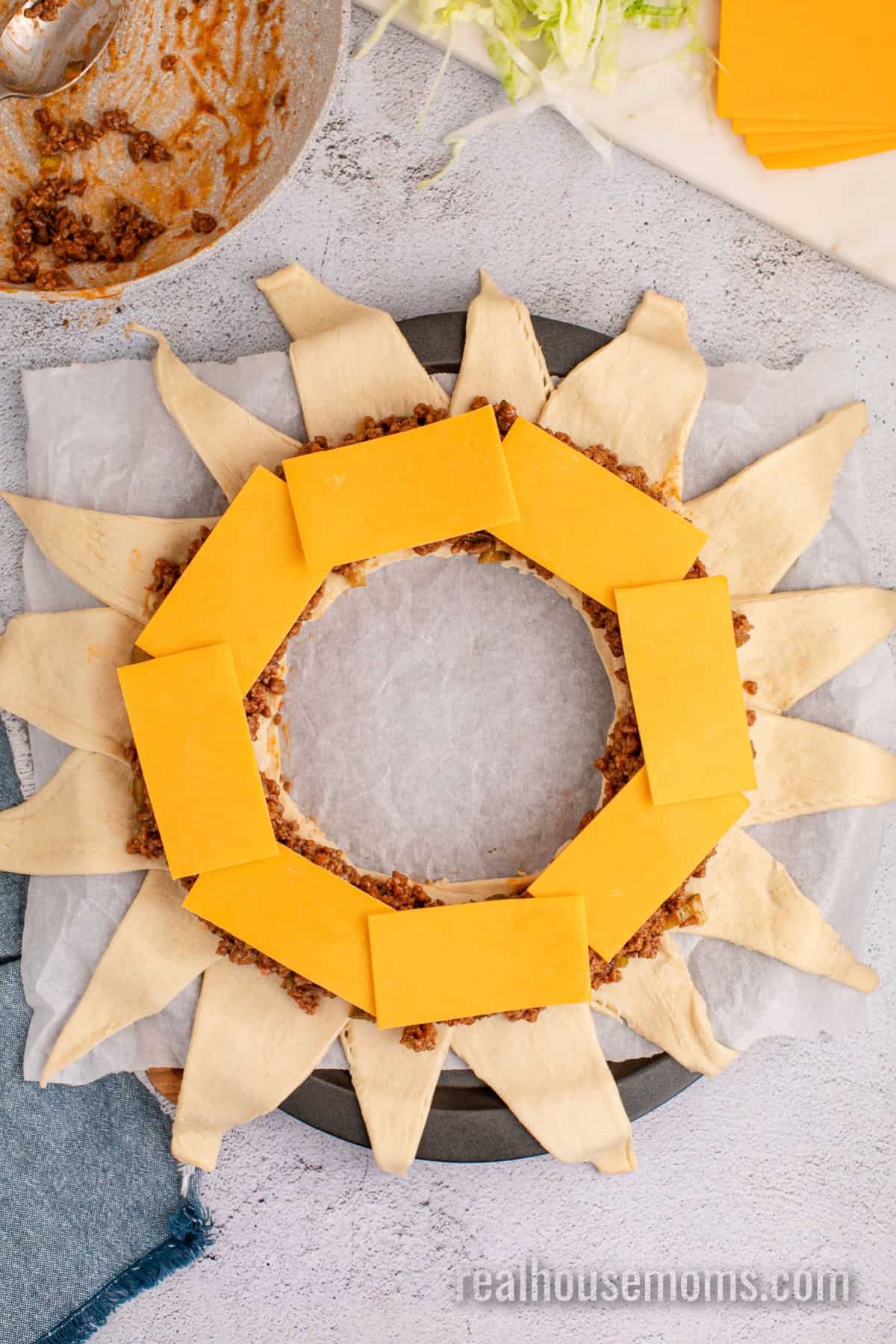 - Spoon the ground beef mixture in a ring over the wider end of the crescent rolls. Then cut the cheese slices in half and place them over the meat. Remove the bowl from the center.