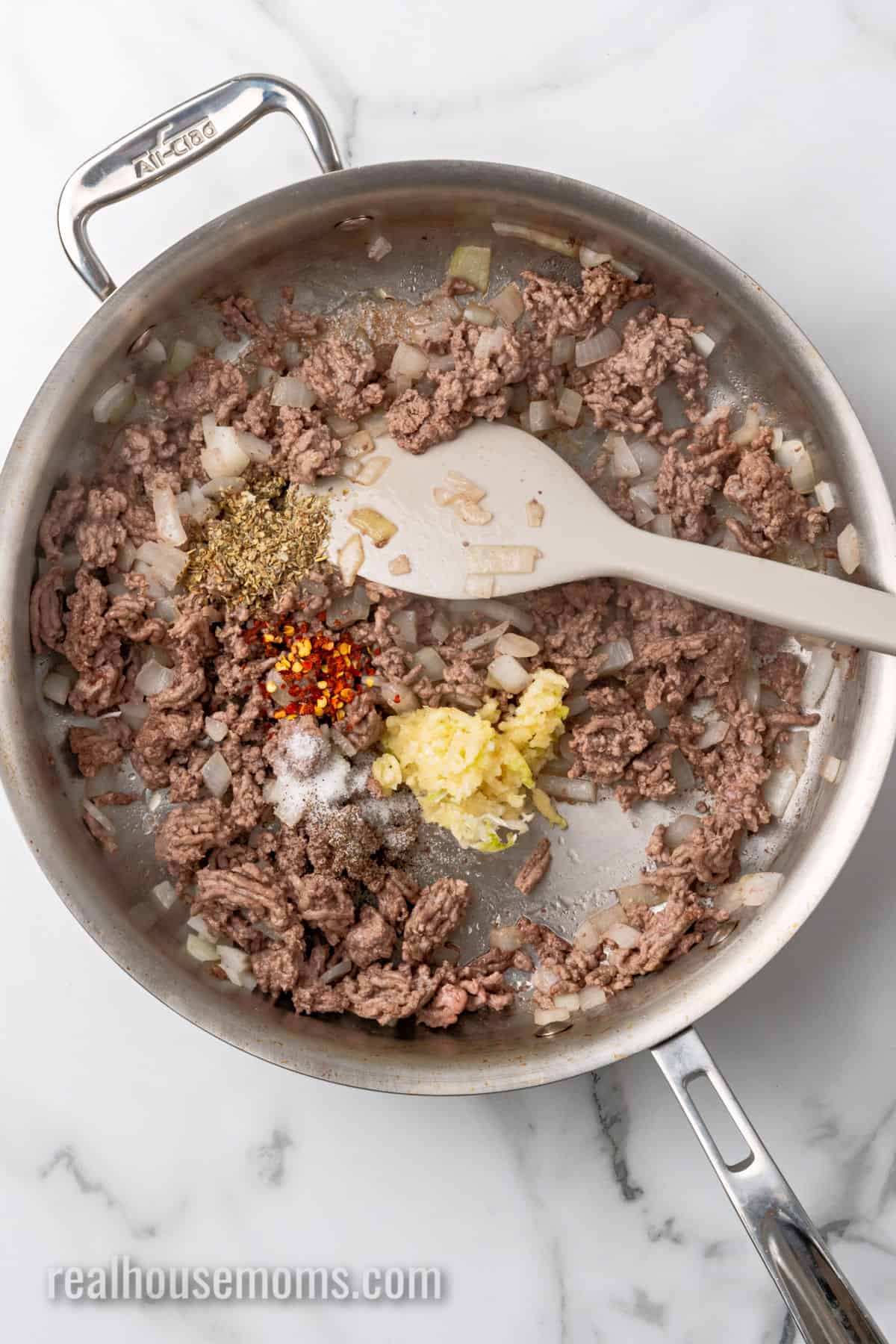 - Place a large skillet over medium heat. Add the ground beef and onion and cook for 6-8 minutes, breaking up the meat as it cooks. Add the garlic, Italian seasoning, salt, pepper, and red pepper flakes. Stir to combine and cook for 1 minute.
