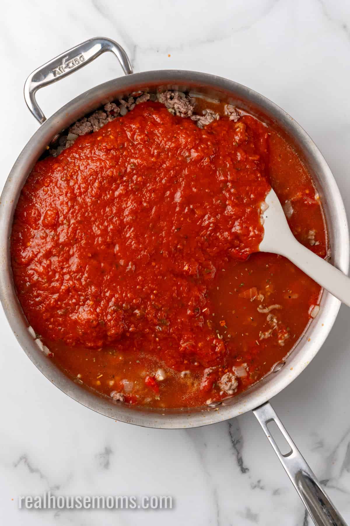 - Pour the marinara and water into the skillet. Stir everything together. Turn off the heat and let the meat sauce sit until ready to use.