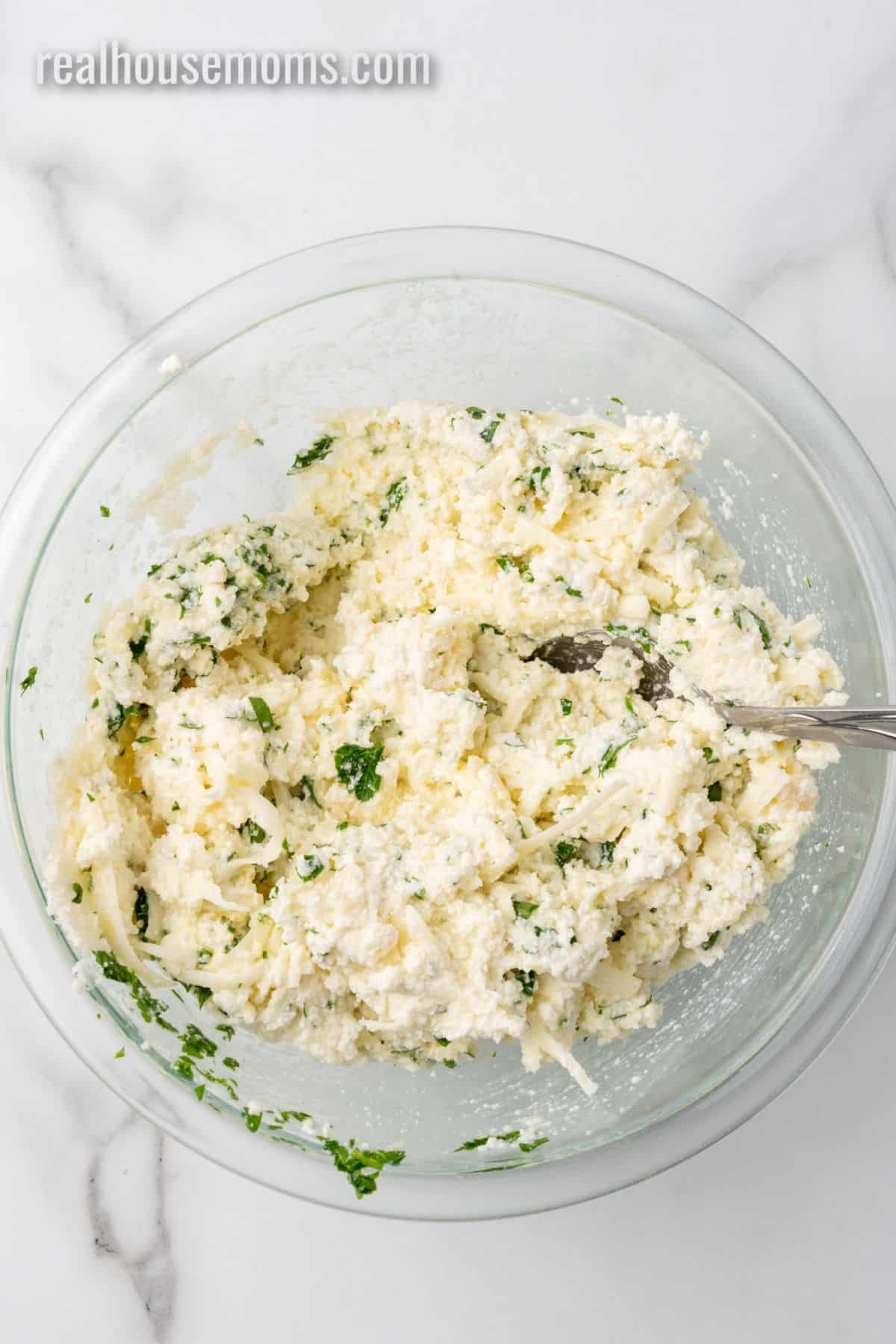 - In a medium mixing bowl, stir together the ricotta, 1 ½ cups mozzarella, ½ cup parmesan, egg, and parsley until evenly combined. Set aside.