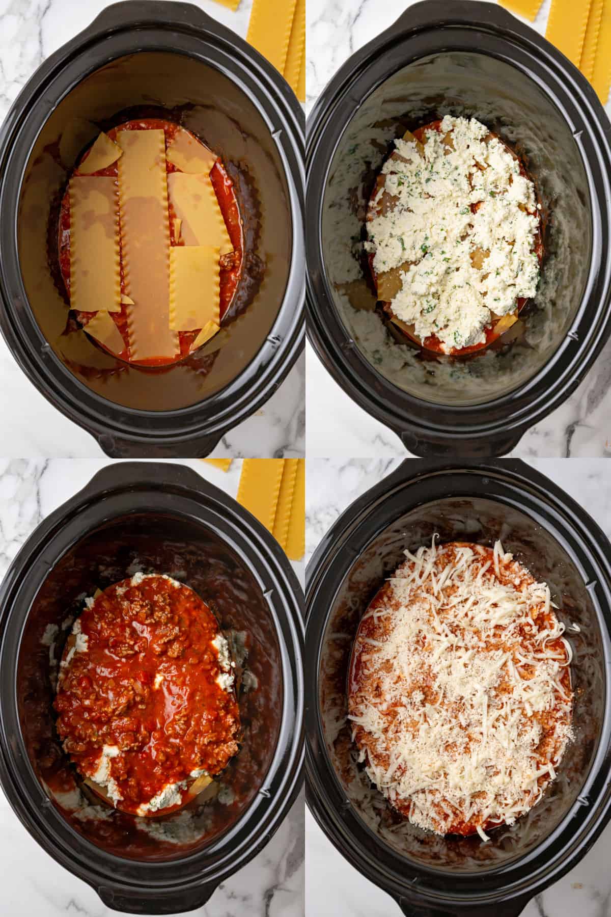 - In a 6-quart slow cooker, spread a layer of meat sauce over the bottom until it's just covered. Top with 3 lasagna noodles (you will need to break them to fit), then add a layer of 1/3 of the cheese mixture, and then a layer of 1/3 of the meat sauce. Repeat with the remaining ingredients, for a total of 3 layers. Sprinkle the rest of the mozzarella and parmesan over the top layer of meat sauce.