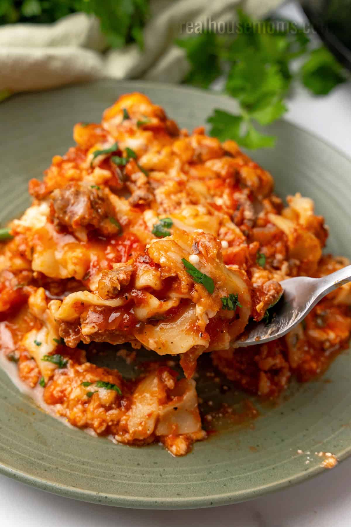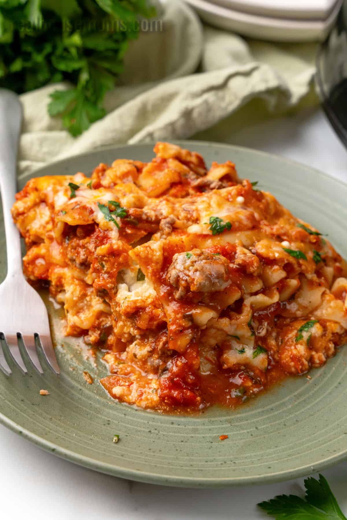 STEP SIX: When dinner is done, remove the lid and let the lasagna cook for an additional 10 minutes before serving. Garnish with a sprinkle of parsley and serve with a side salad and garlic bread. It’s a FEAST!