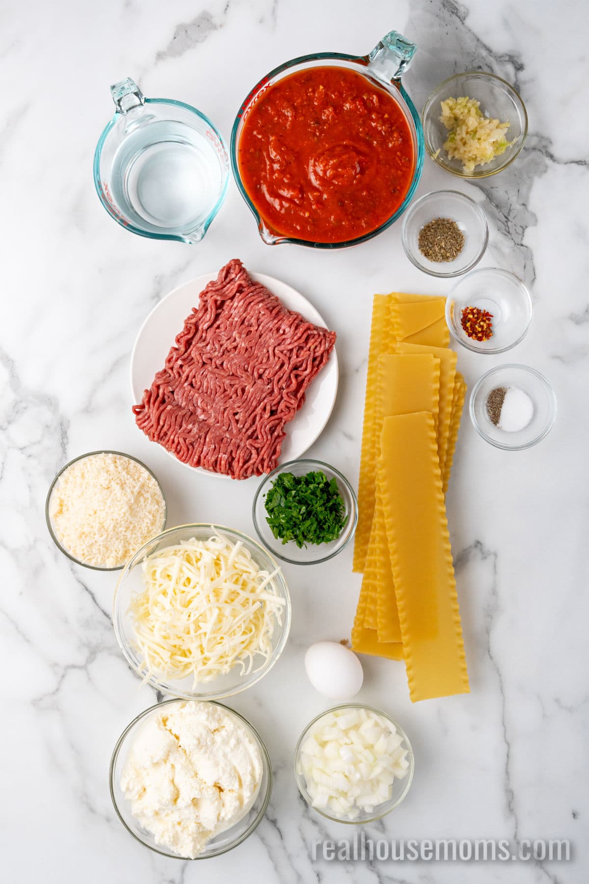 Meat Sauce: We’re using lean ground beef, along with yellow onion, garlic, salt, pepper, red pepper flakes, and Italian seasoning. Then grab your favorite marinara sauce and some water (to help cook the pasta).