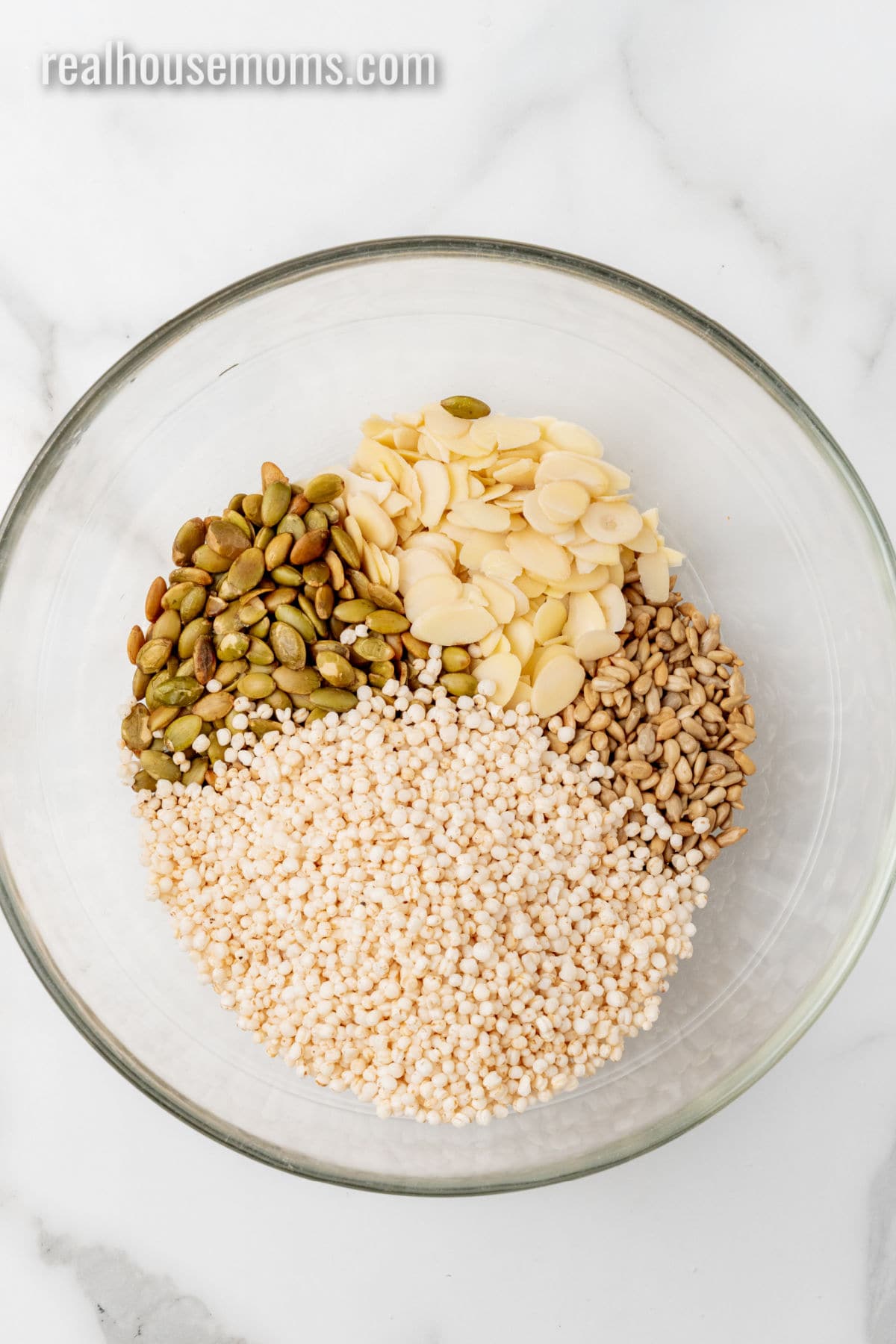 STEP TWO: In a large bowl, combine the sunflower seeds, pumpkin seeds, sliced almonds, and puffed quinoa and stir to mix.