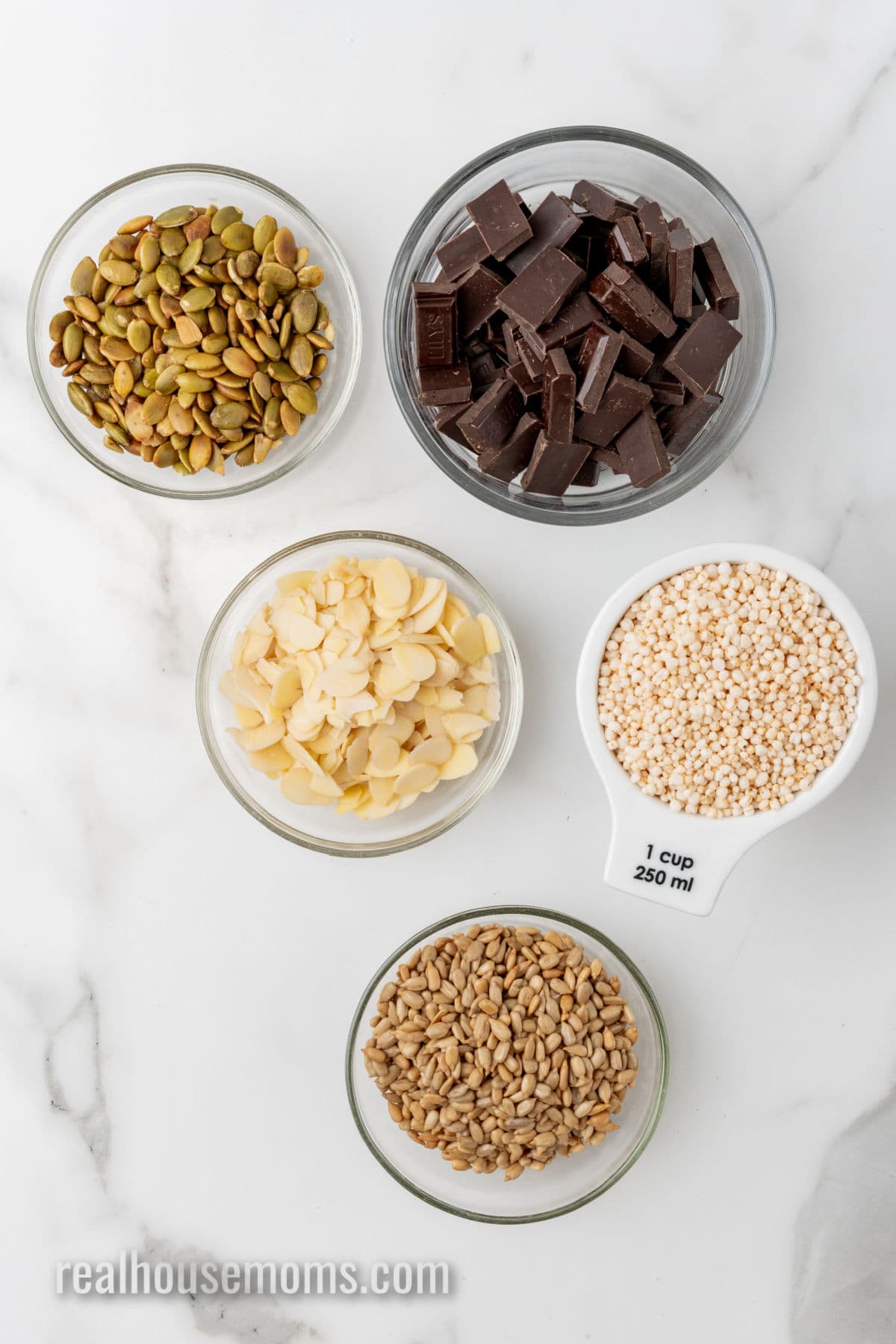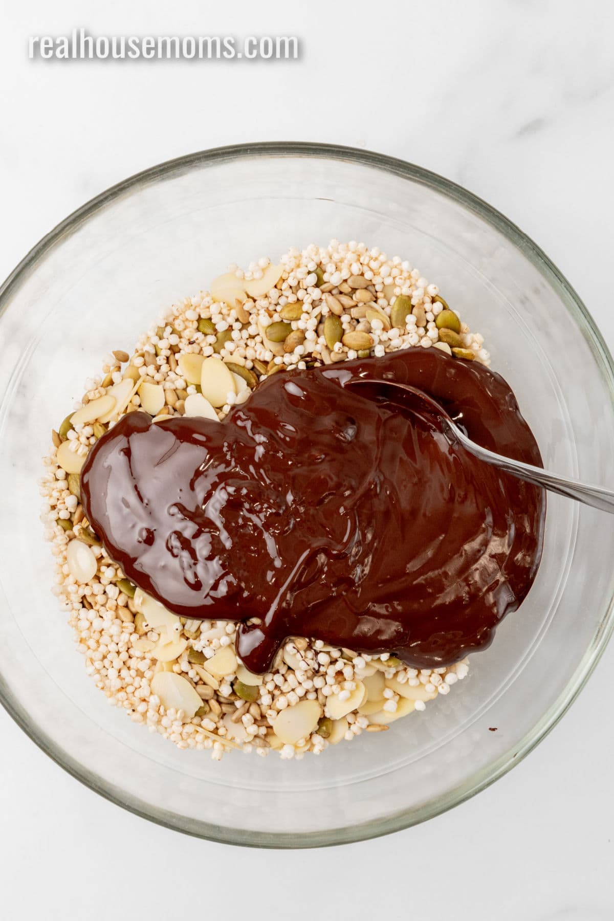 - In a large mixing bowl, stir together the quinoa, sunflower seeds, pumpkin seeds, and almonds. Pour the chocolate over the mixture and then stir until fully combined.