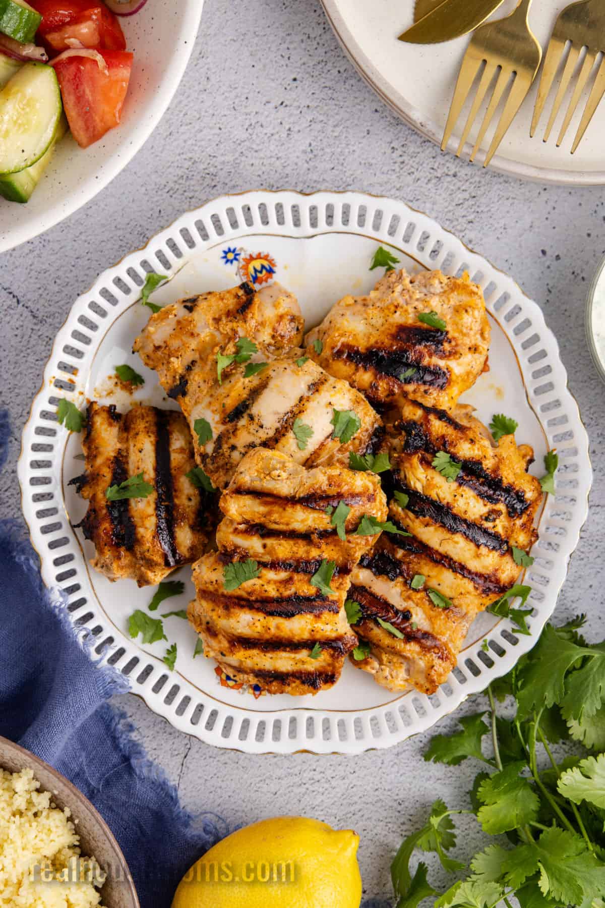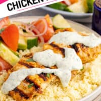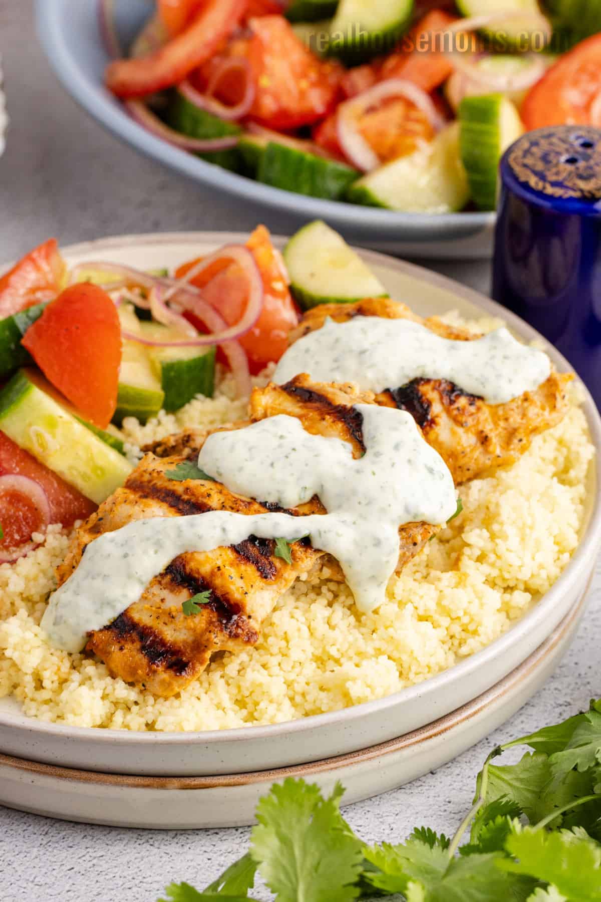 For a simple bowl, serve it over Lemon Couscous, rice, or even greens with plenty of that cilantro yogurt sauce on top. If you want to lean into the fresh Mediterranean flavors, add a Cucumber Tomato Salad on the side or some roasted vegetables. Warm flatbread is also a favorite, especially if you want to slice or shred the chicken and turn it into an easy wrap with veggies and extra sauce.