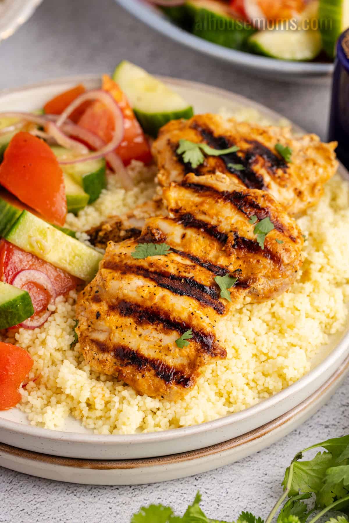 This chicken is also delicious with roasted sweet potatoes, lentil soup, or even a scoop of pasta salad if you want to keep things easy and family-friendly. And for a really great full plate, I love serving it with Curried Couscous and a fresh Greek Salad for a dinner that feels colorful, balanced, and full of flavor.