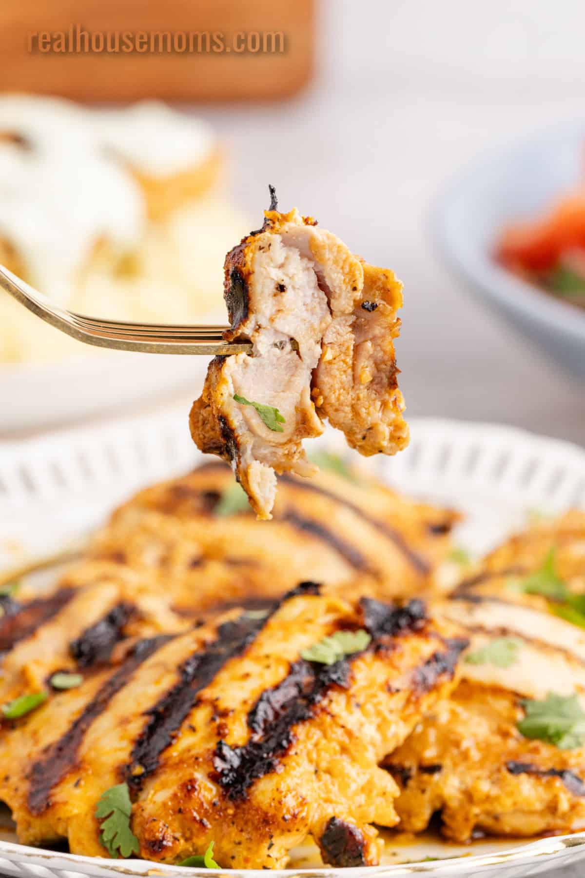 Chicken thighs are the best choice here because they stay juicy, flavorful, and tender even over high heat. Boneless skinless thighs also absorb the marinade well and are a little more forgiving on the grill.