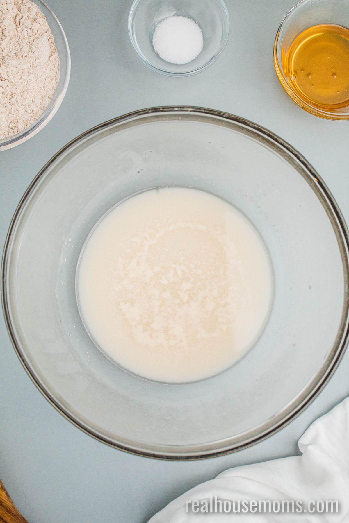 STEP ONE: Combine the warm water, yeast, and one tablespoon of honey in a large bowl and cover the bowl to let the yeast activate.