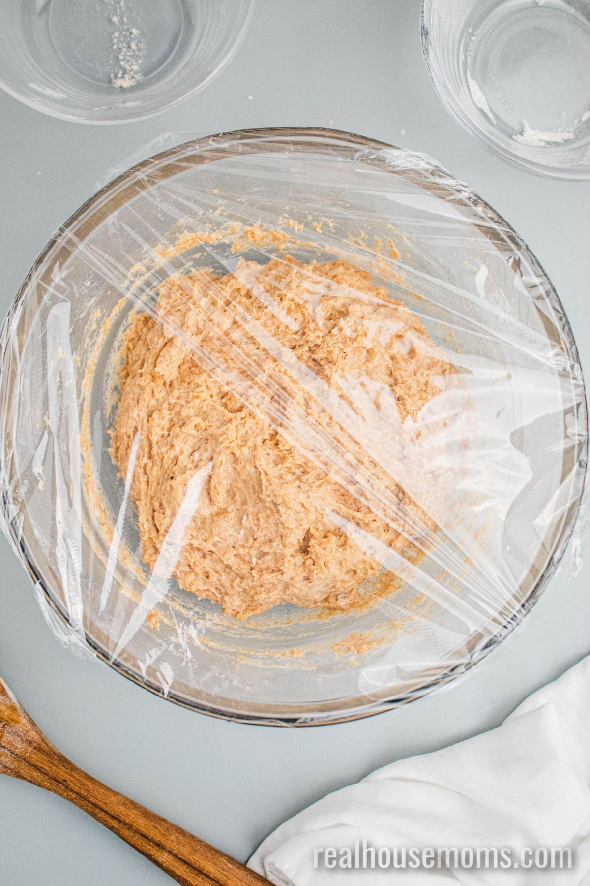 - Use a wooden spoon to incorporate the all-purpose flour, mixing until well combined. Scrape the sides of the bowl as needed. Cover the bowl with plastic wrap and let it rise for 1 ½ to 2 hours or until the dough doubles in size.