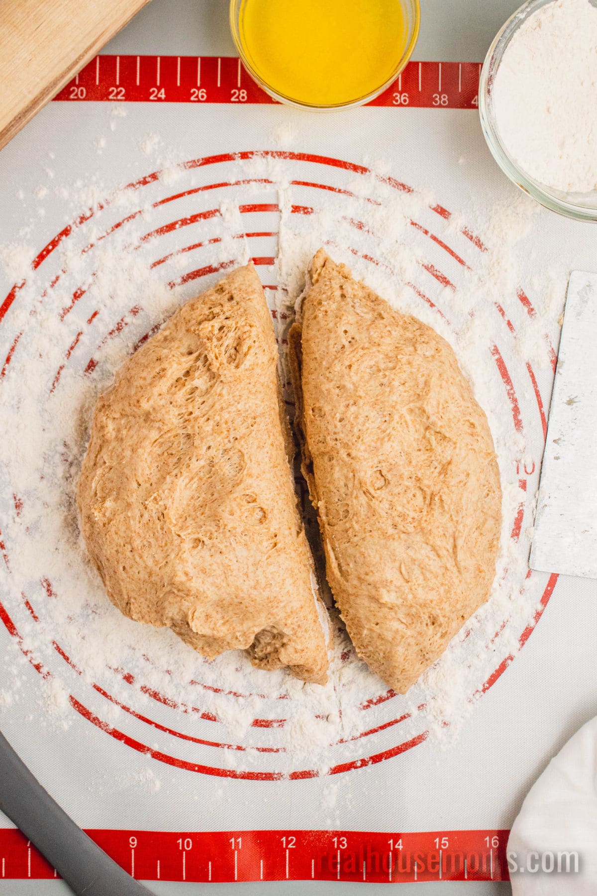 STEP THREE: Grease two baking sheets and set them aside. Punch out the dough to release the air and divide the dough into two halves.