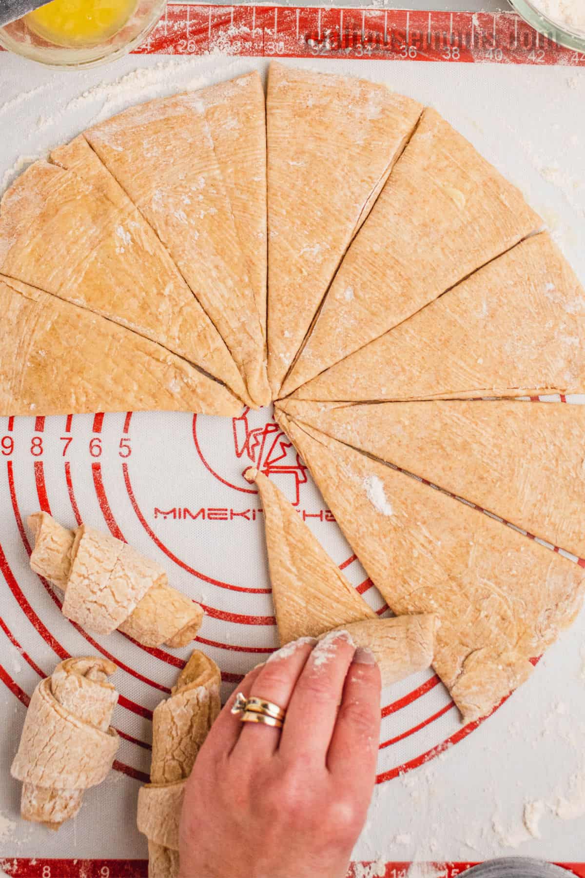 - Use a pizza cutter to slice the disc into 12 wedges. Roll up each dough wedge, starting at the bottom (wide end) of the triangle and rolling up to the point. Place the rolls point side down onto the prepared baking sheet. Repeat with the rest of the dough.