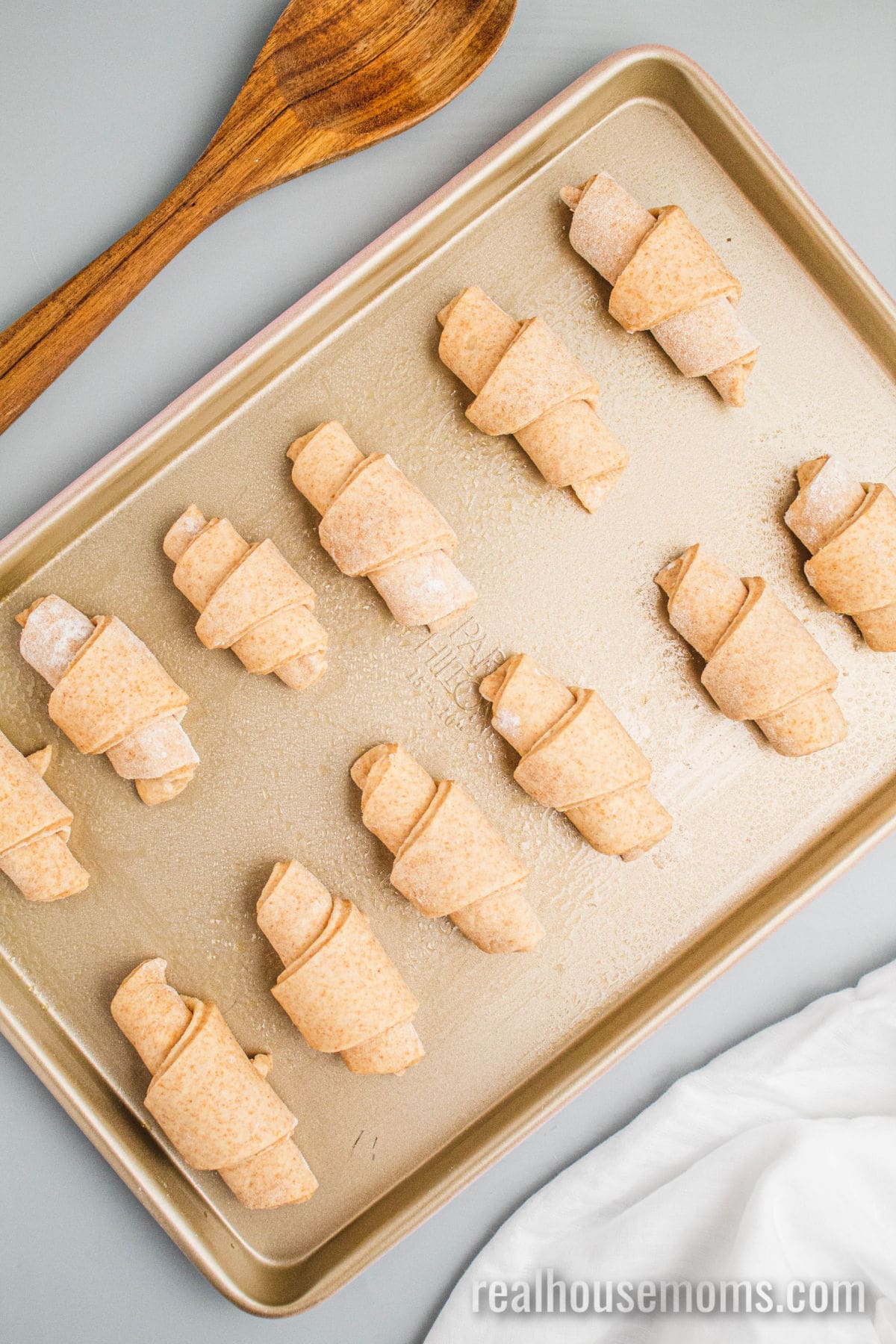 STEP FIVE: Roll each wedge of dough, starting at the bottom and rolling up to the tip, and place the rolls on the prepared baking sheet. Repeat with the other half of the dough, and then cover both sheets with a towel or plastic wrap and allow the rolls to rise again for 1 1/2-2 hours.