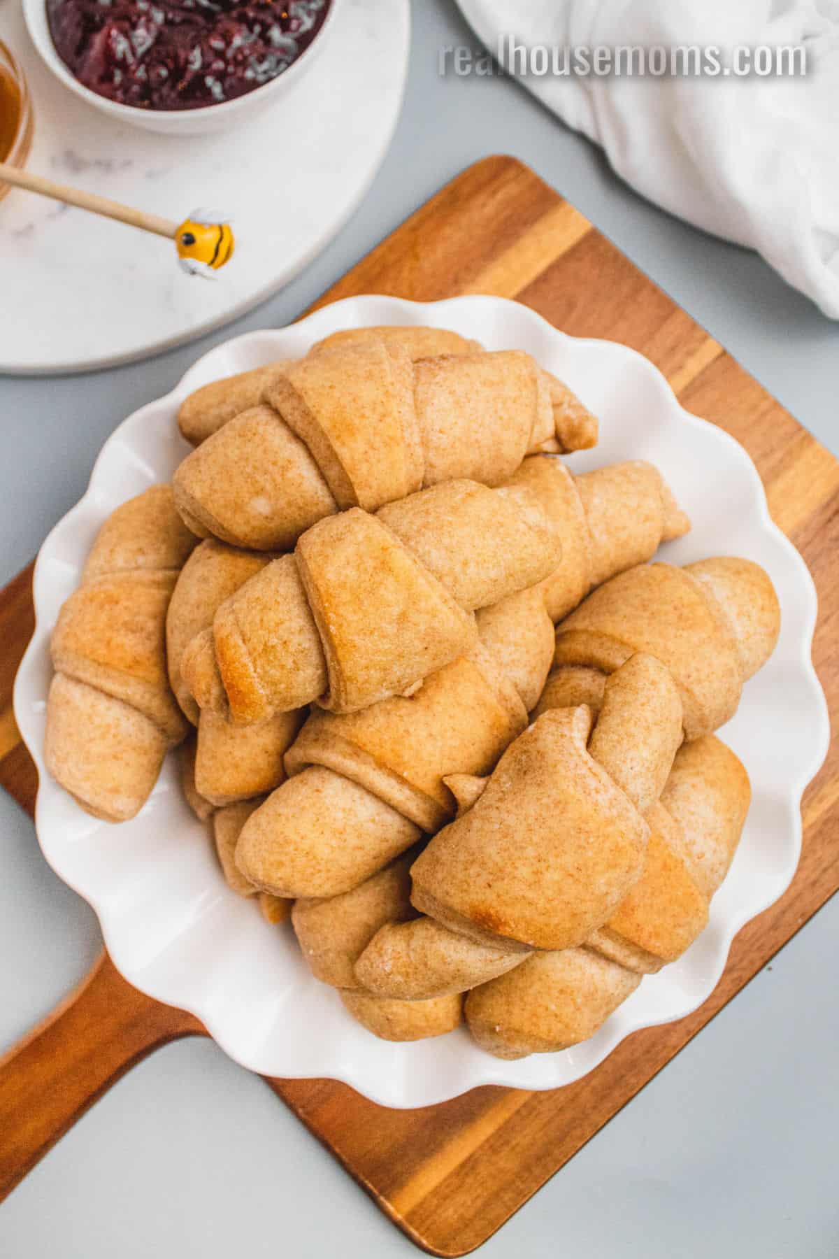 No one in this house will ever say no to bread of any kind, it’s kind of our kryptonite! It’s nice to have easy bread options, although these Honey Wheat Dinner Rolls are made a little more often here than other breads. Not only are they simple to make, but the addition of whole wheat flour makes these rolls more nutritious than white flour rolls, with more protein, vitamins, and minerals. Wheat rolls are light with a touch of sweetness that makes them perfect to serve with your favorite roasts, salads, pasta, and any of your other favorite meals!