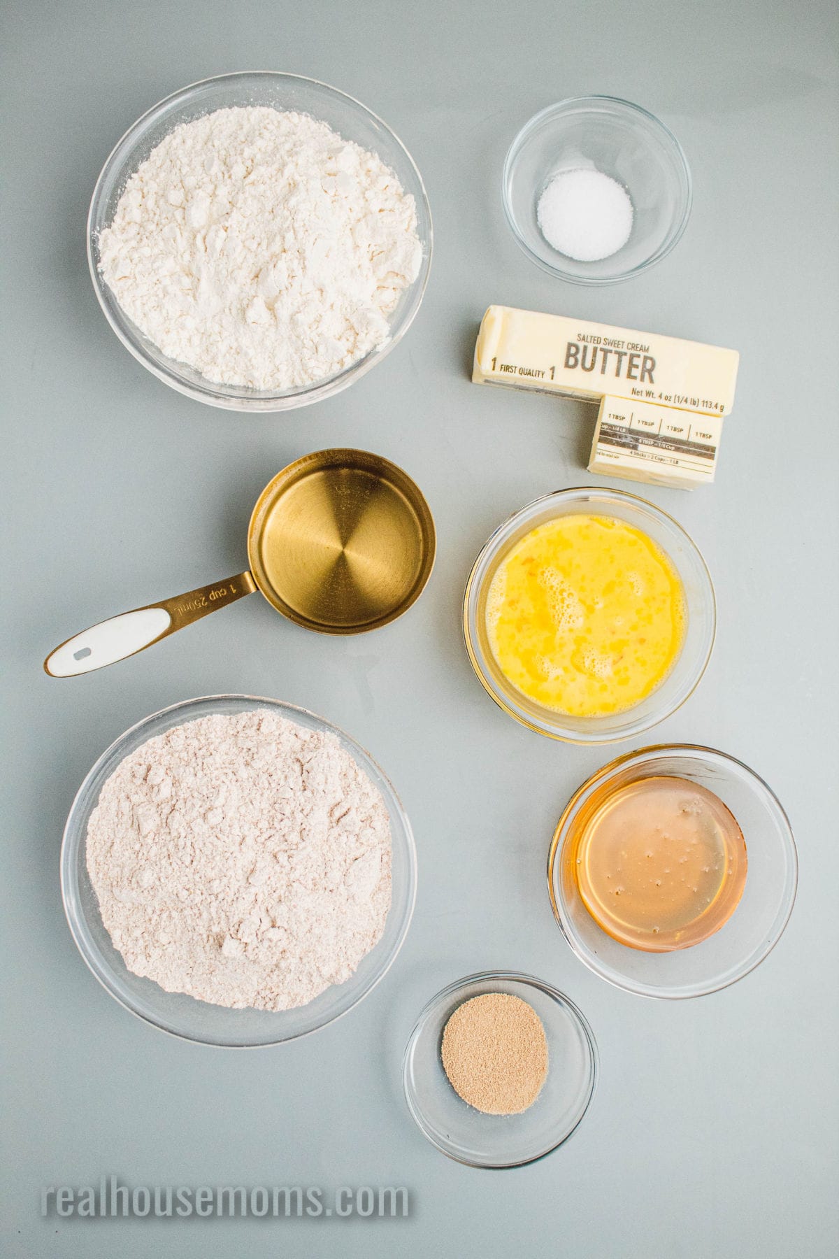 Dry Ingredients: You will need whole wheat flour, all-purpose flour, active yeast, and salt.
