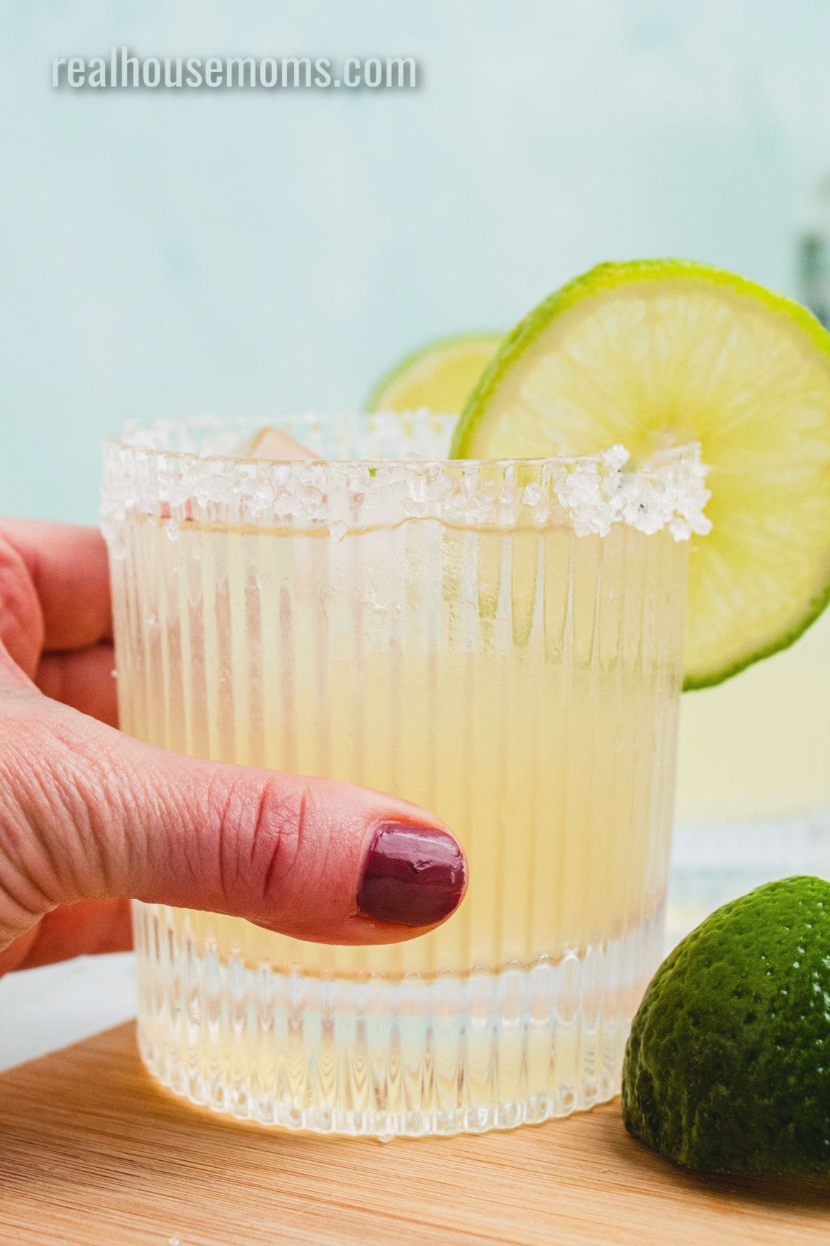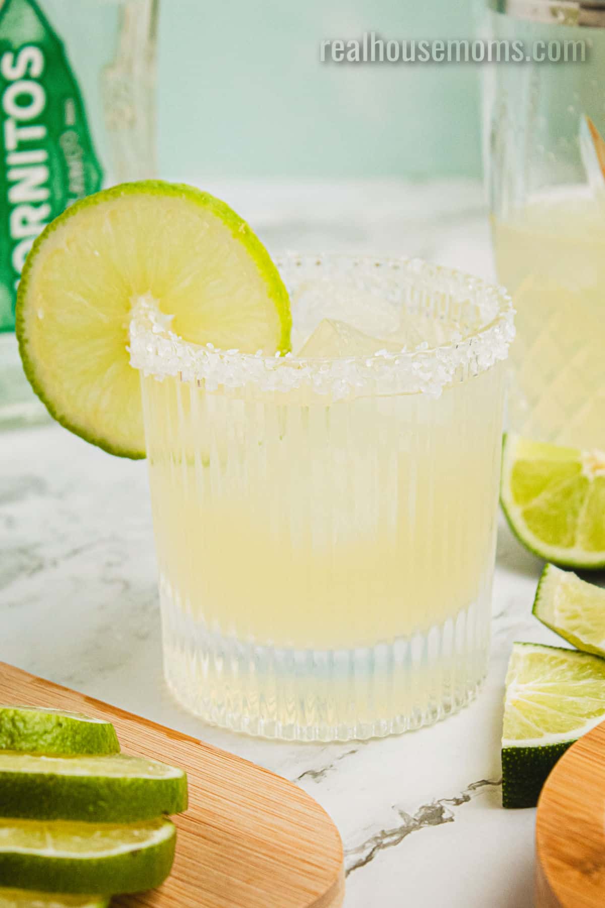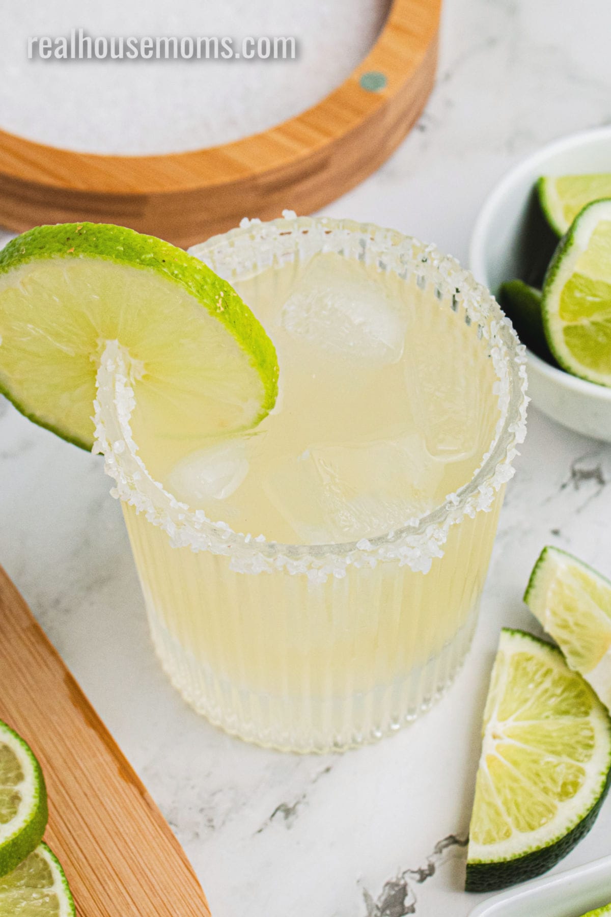 - Run a lime wedge around the rim of a rocks glass (or margarita glass), and then dip the rim into margarita salt. Carefully fill the glass with ice so you don't knock off much salt. Set aside.