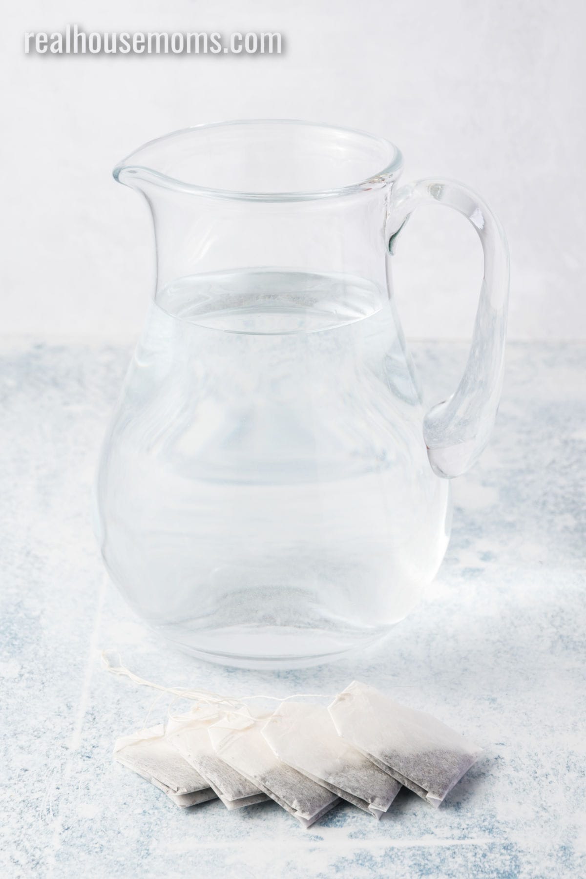 - Fill a 2-quart or large glass jar or pitcher with 8 cups filtered water. Add 4-5 bags black tea bags. If the bags have paper tags, you can tie them together and hand them over the edge. Cover the jar loosely with a lid or plastic wrap (to keep out debris and bugs).