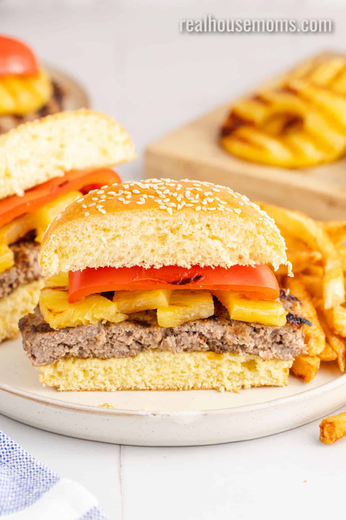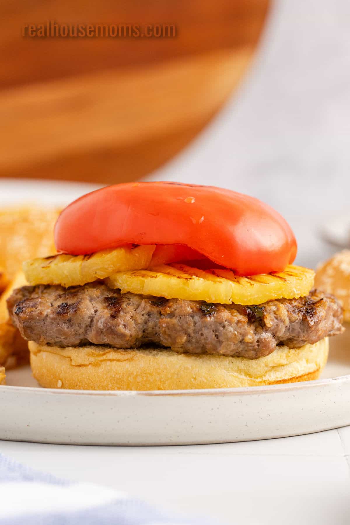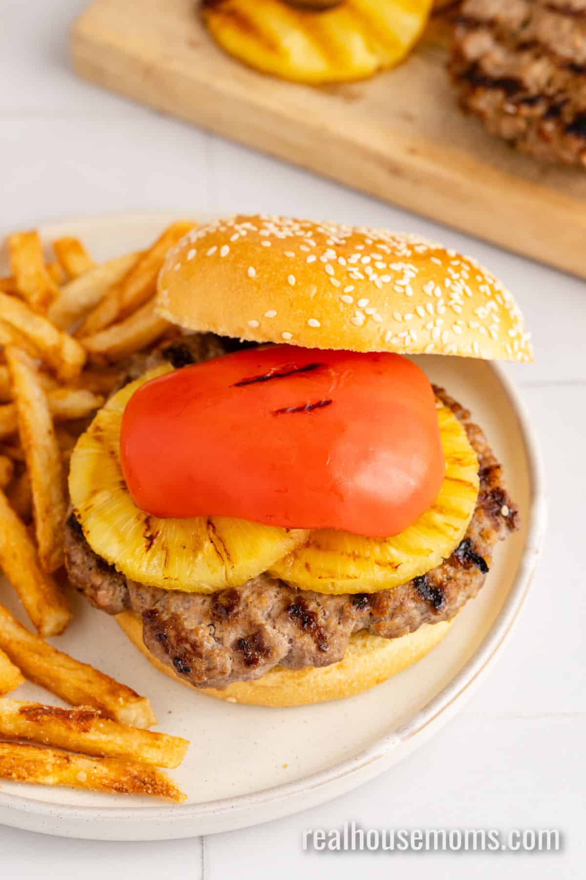 Toppings: Pineapple rings (fresh or canned) and a sliced red bell pepper top this burger beautifully!