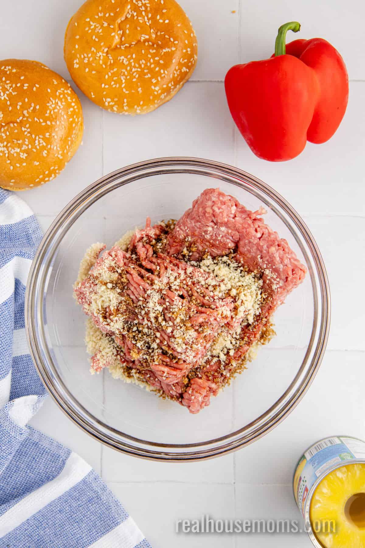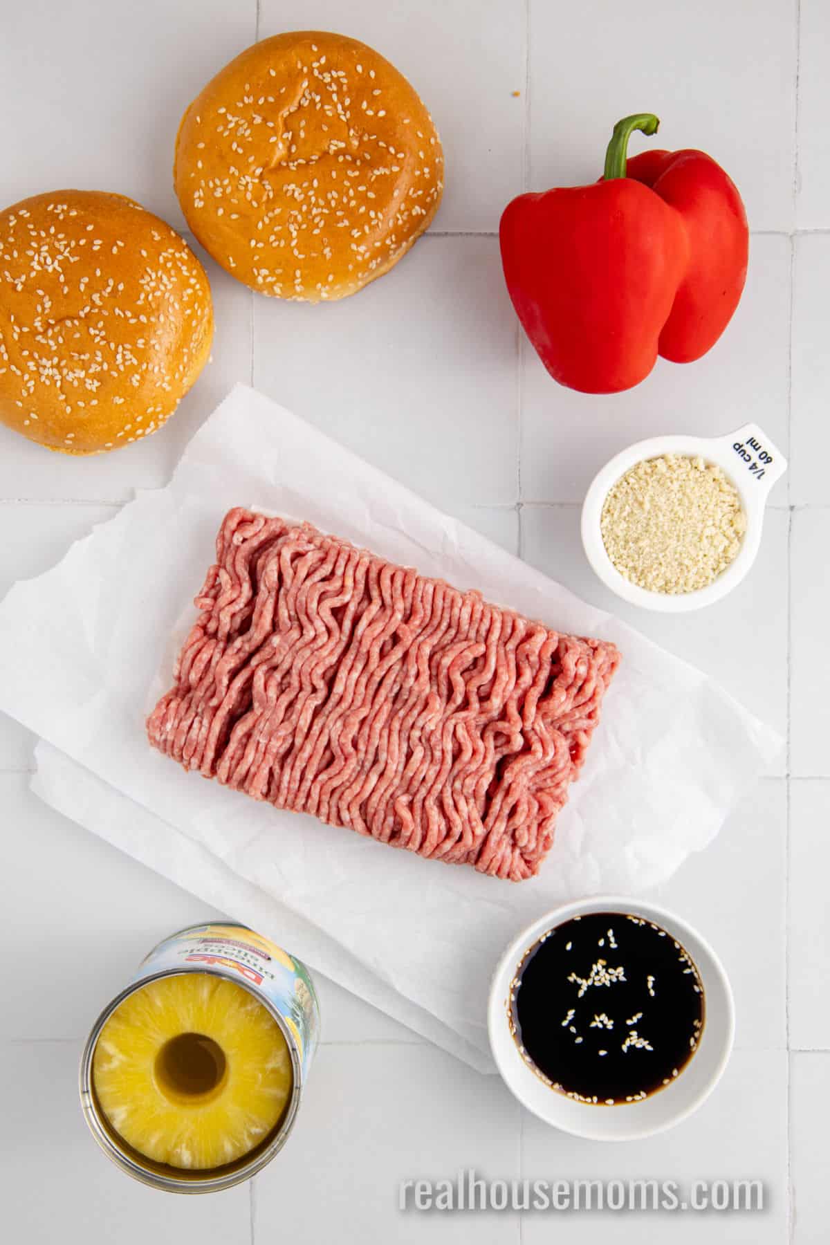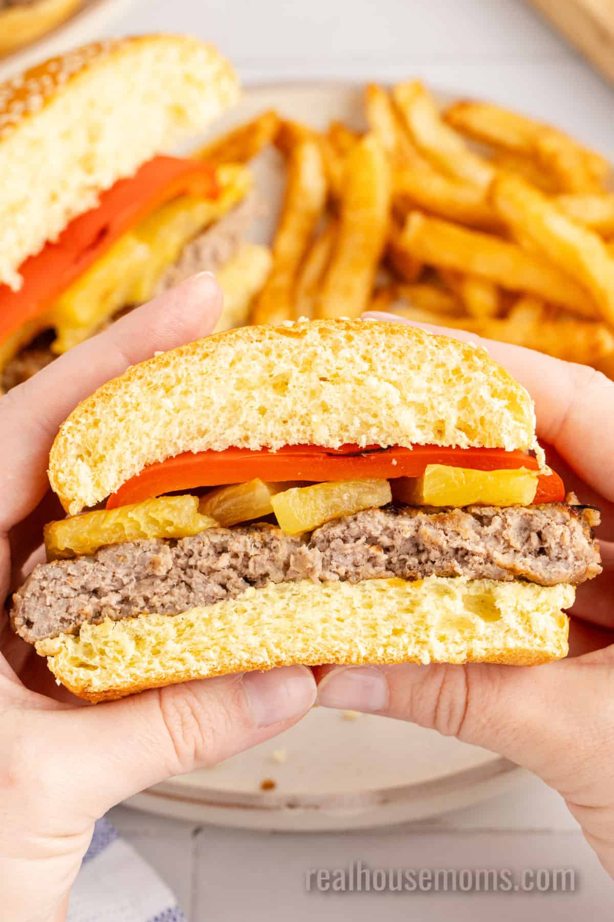 Toppings: Pineapple rings (fresh or canned) and a sliced red bell pepper top this burger beautifully!