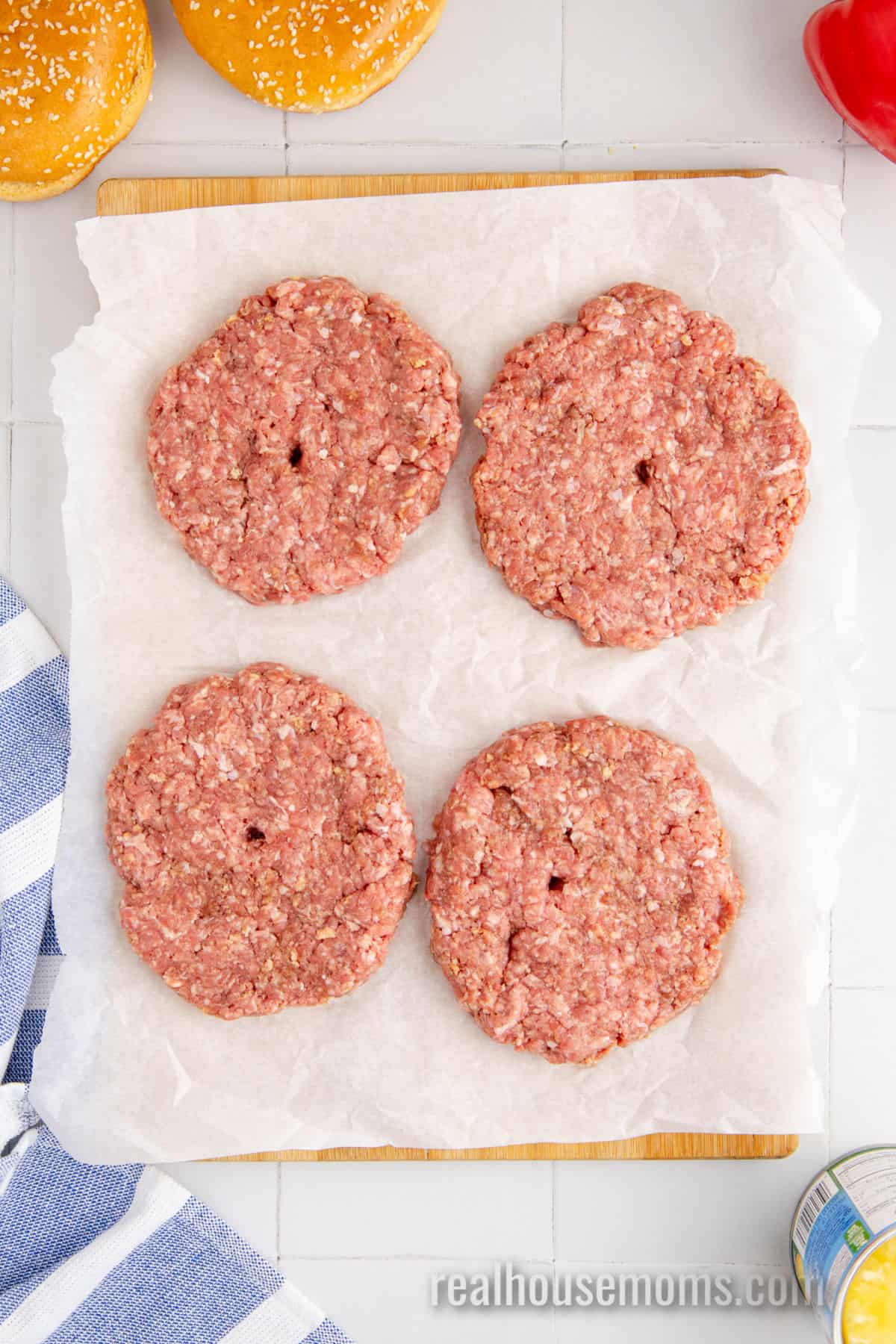 - Take the ground beef out of the fridge and for the mixture into 4 evenly sized patties. Set aside. Cut the cored bell pepper into 4 large pieces. Set aside.