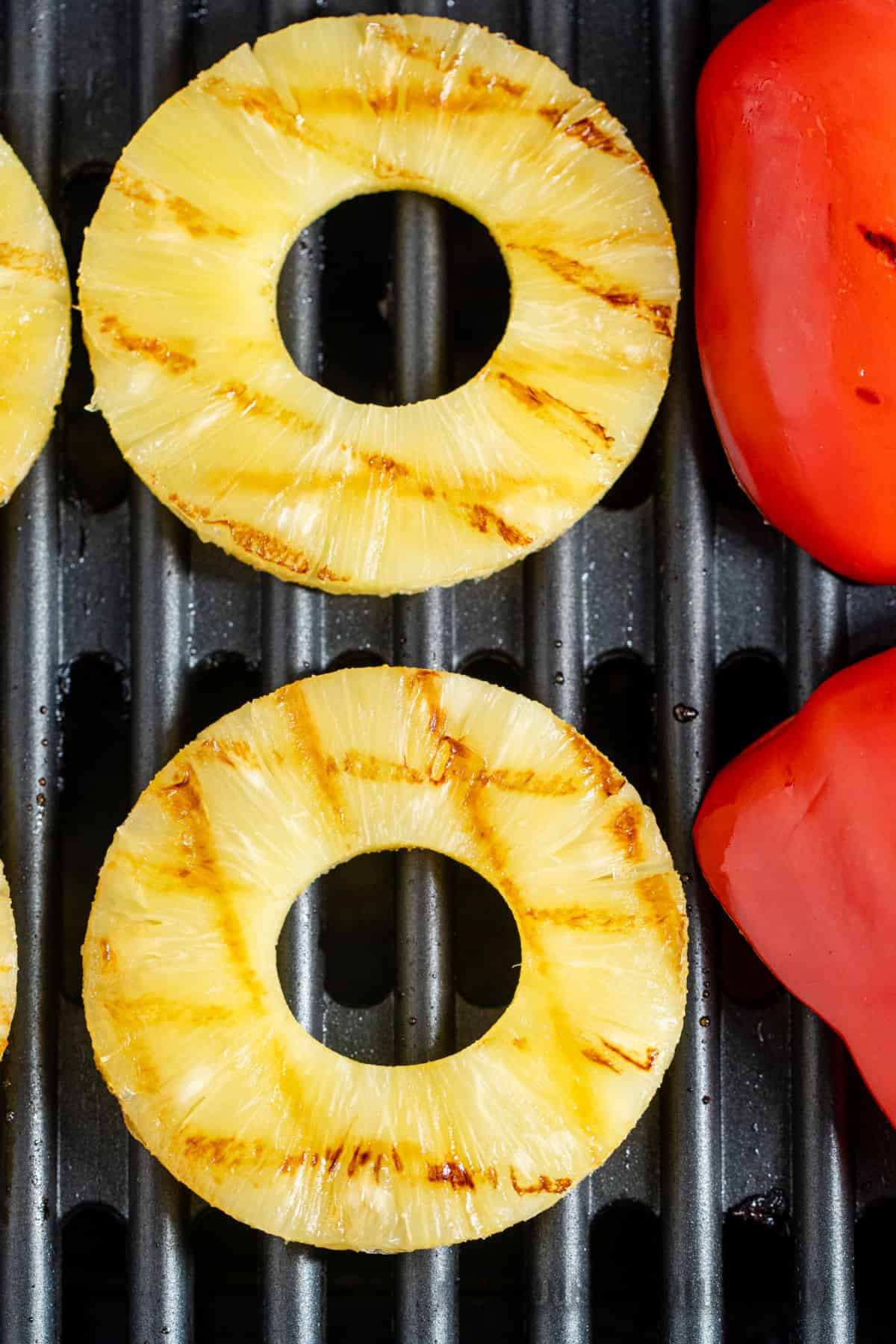 - Grill the pineapple rings for 2-3 minutes per side and the bell pepper pieces for 4-5 minutes per side. Remove from the grill to a plate. Toast the bun side of the burger buns for 1-2 minutes on the grill.