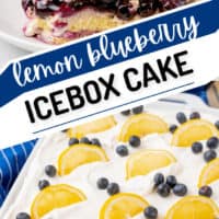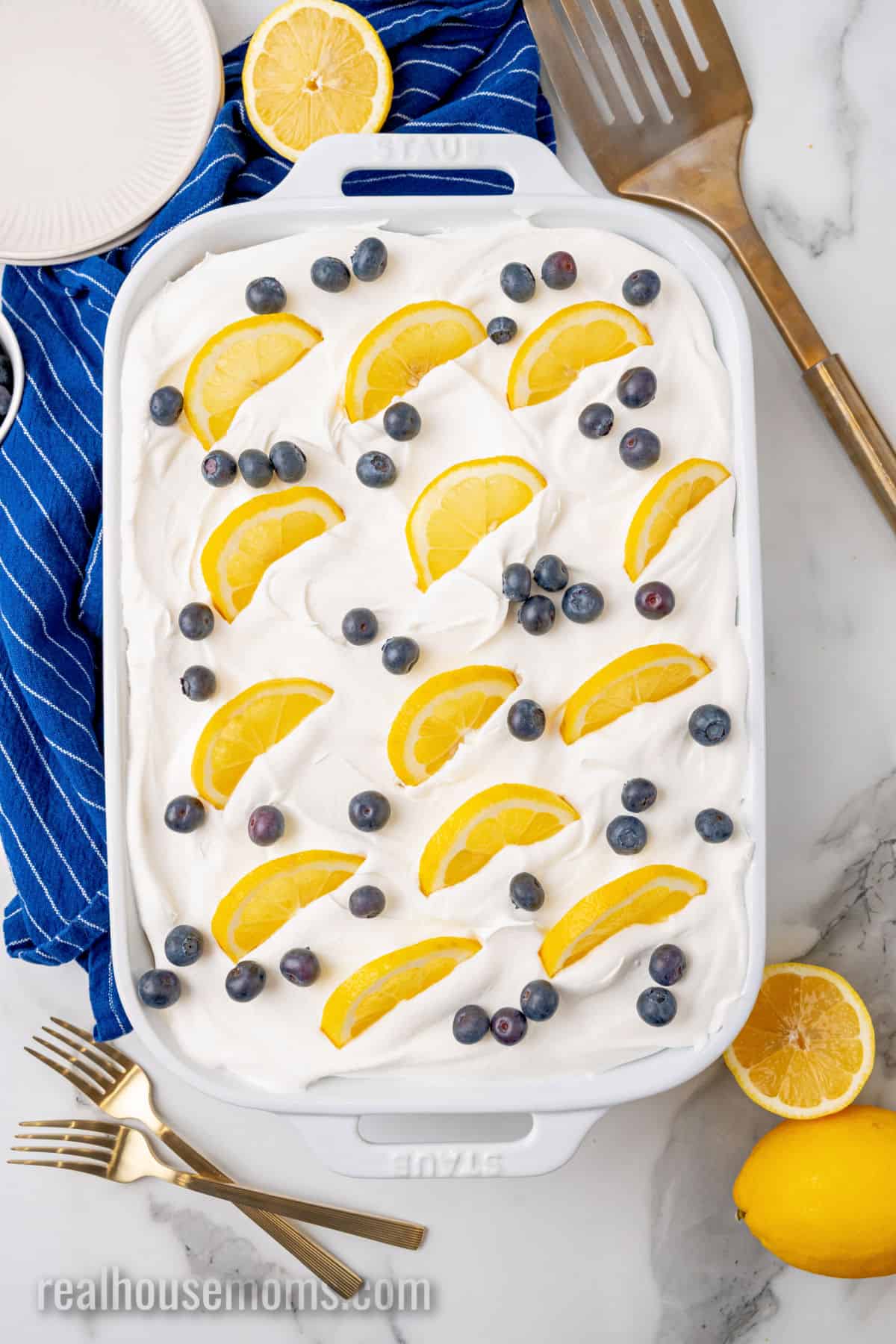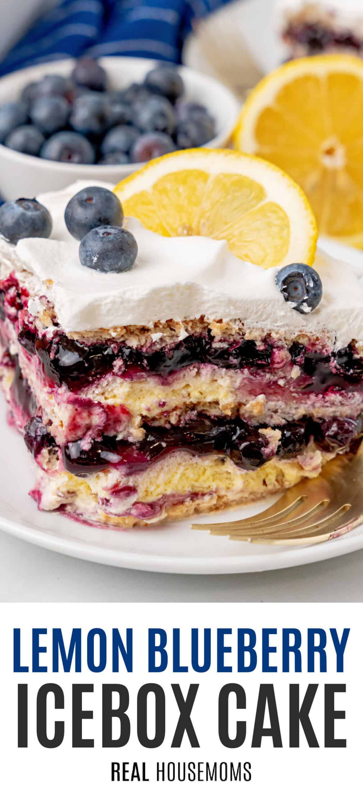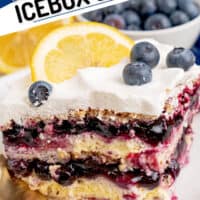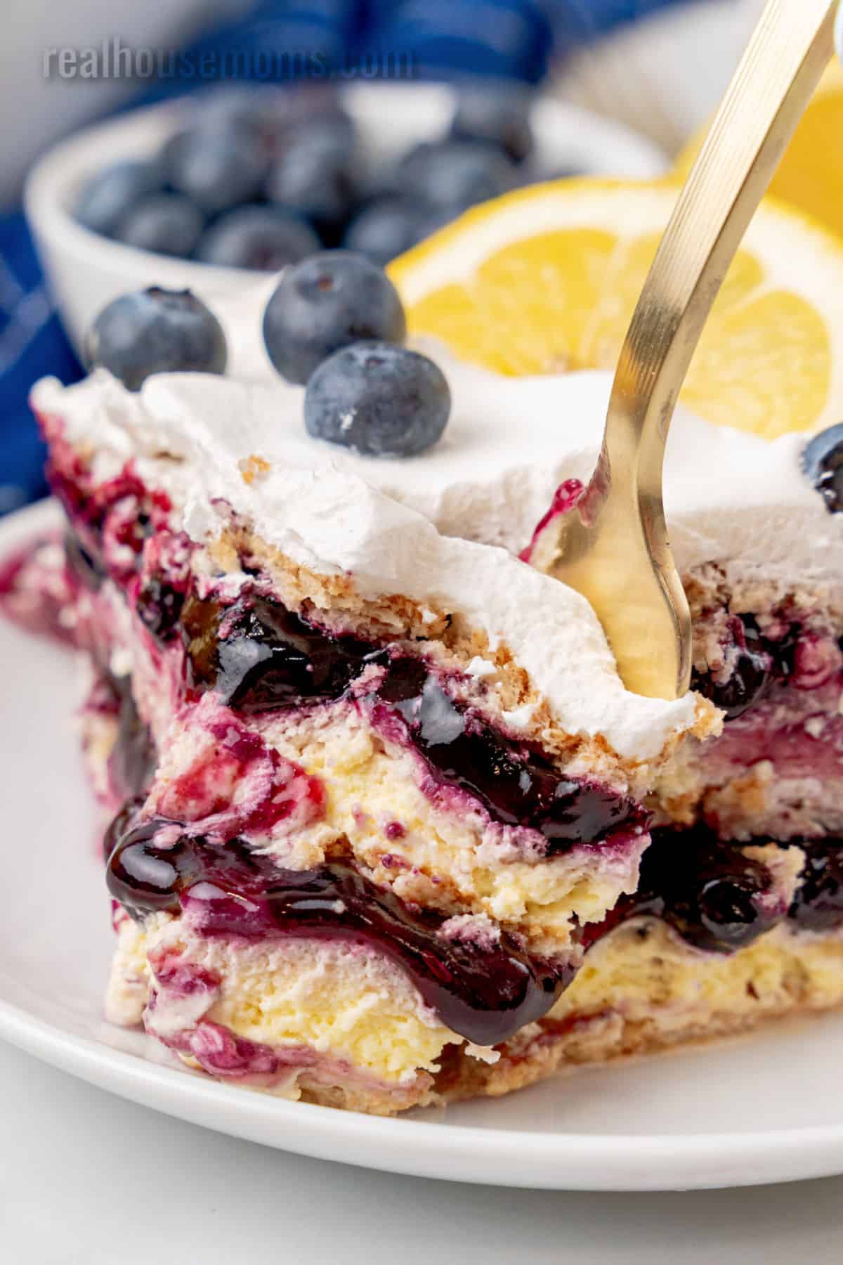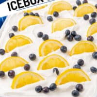 - Right before serving, top the icebox cake with half lemon slices and fresh blueberries for garnish. Cut into 12 slices and enjoy!